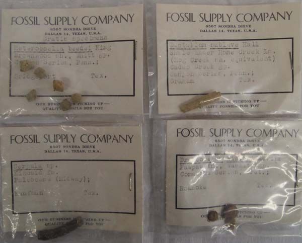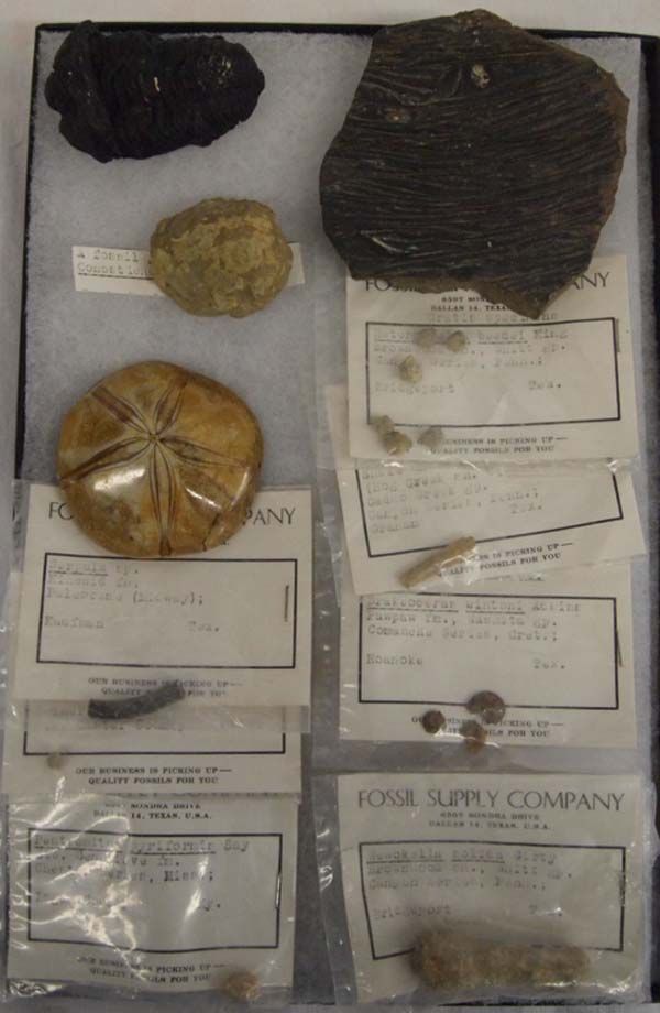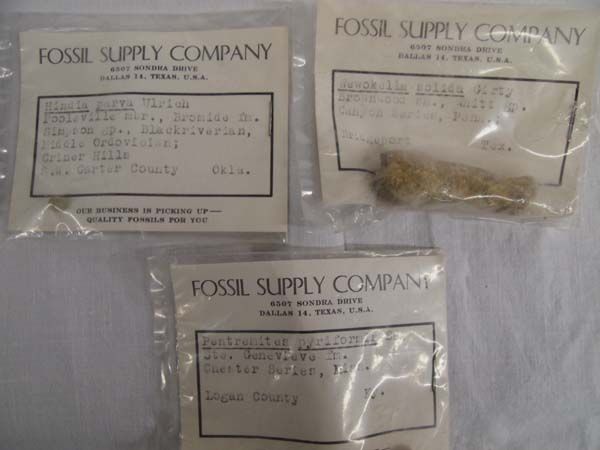 Collection of Fossils, largest measures 4''D, includes #1 Fossilzed Sand Dollar #2 Fossilized Jellyfish #3 Trilobite and 7 bagged specimens from the Fossil Supply Company Dallas TX, #4 Dentalium subleve #5 Drakeoceras wintoni #6 Serpula sp. #7 Pentremites pyriformis #8 Wewokalla solida #9 Heterococlia beedei #10 Hindia parva