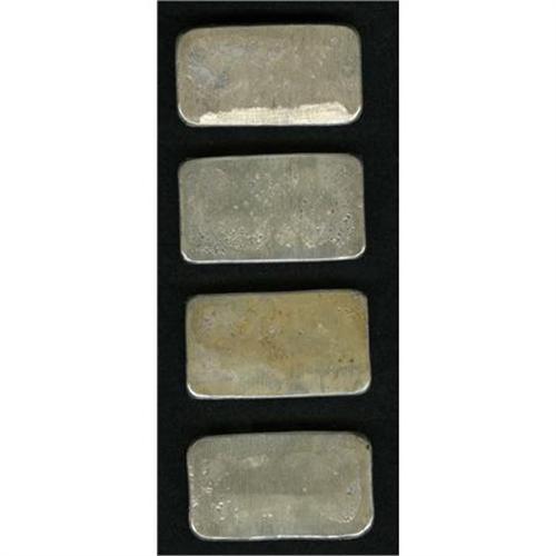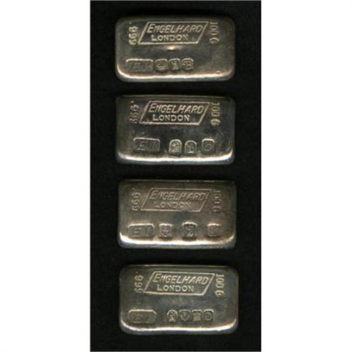 <B>Collection of Four British Hallmark Silver Bars.</B></I> Four silver .999 fine 100-gm bars manufactured by Engelhard, London. Each of the bars has a location mark for the cities of London, Birmingham, Sheffield, and Edinburgh, all housed in a plastic case and stamped with the year of production, 1969.<BR><BR><b>Shipping:</b> Coins & Currency (<a target="_blank" href="http://www.heritageauctions.com/common/shipping.php">view shipping information</a>)