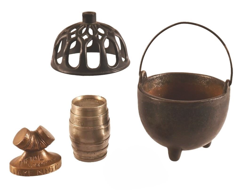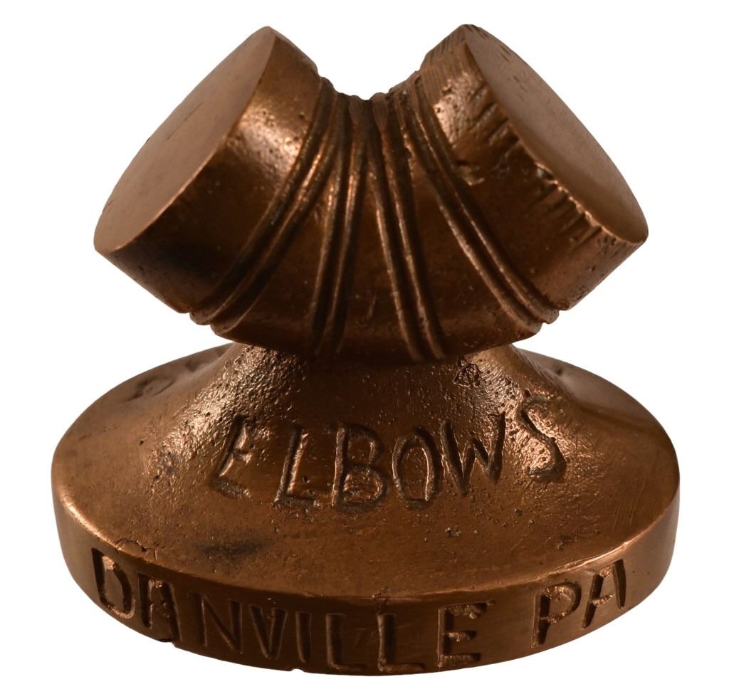 4 pieces. Barrel is advertising Berry Brothers Celebrated Varnishes. The Pipe fitting is advertising Elbows, Danville, PA. Metal Stamping, Lake MFG Coin.