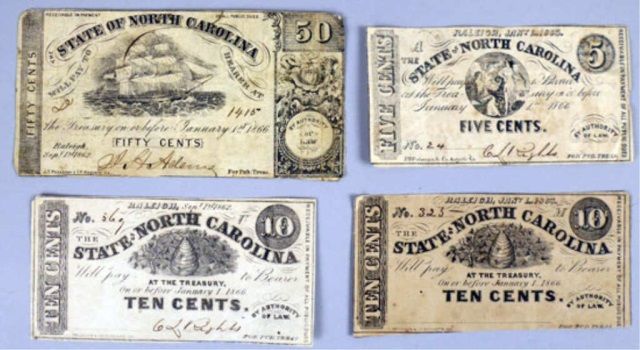 from North Carolina including 5 cent, (2) 10 cents and one 50 cent notes. All very good to excellent.