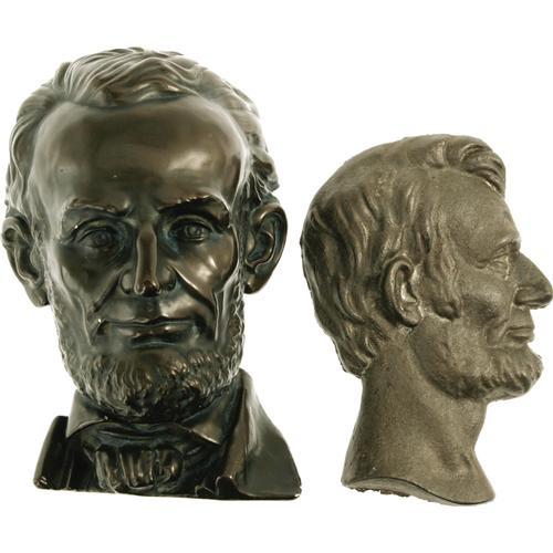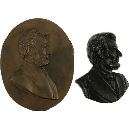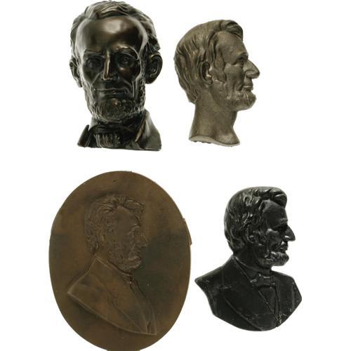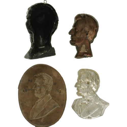 <B>Collection of Four Lincoln Relief Wall-Hangings.</B></I> 1.) Small gray metal Lincoln relief profile wall-hanging measures approximately 4.75" wide at its widest point x 6.75" tall. No artist's or maker's mark indicated. Very good condition. 2.) Small black Lincoln relief profile wall-hanging measures approximately 6" wide at its widest point x 7.75" tall. No artist's or maker's mark indicated. Small wear to the black paint throughout. Otherwise very good. 3.) Plaster hollow-back Lincoln face-front wall-hanging measures approximately 5" wide at the ears x 3.25" deep x 7.75" tall. No artist's or maker's mark indicated. A few small chips to the plaster, but otherwise very good. 4.) Imperial Brass Mfg. Co. oval-shaped brass Lincoln relief profile wall-hanging measures approximately 8" at the horizontal axis of symmetry and 10.5" at the vertical axis. Very good, with no apparent age wear.<BR><BR><b>Shipping:</b> Miscellaneous Collectibles, Larg (<a target="_blank" href="http://www.heritageauctions.com/common/shipping.php">view shipping information</a>)