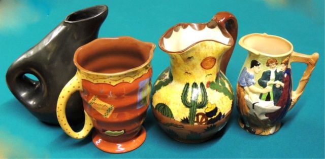 Burgess & Leigh 19th Century pitcher and two hand painted Mexican margarita pitchers.