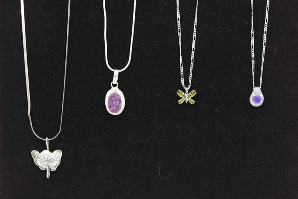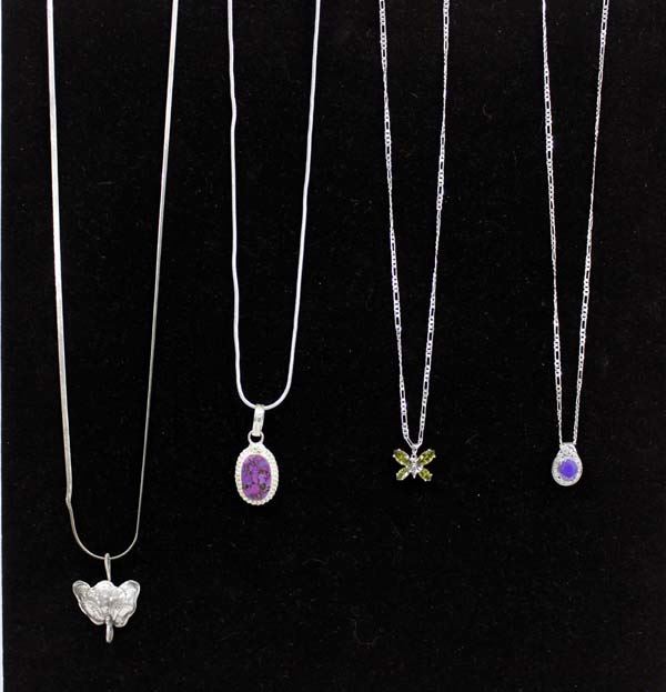 Collection of Sterling Silver Necklaces, longest chain measures 22" end to end, includes #1 Sterling Peridot Butterfly Pendant Necklace, #2 Sterling Amethyst Pendant and Diamond Accent Necklace, #3 Sterling and Lab Sugilite Pendant Necklace, #4 Sterling Elephant Pendant Necklace, 37.74g in total wt.