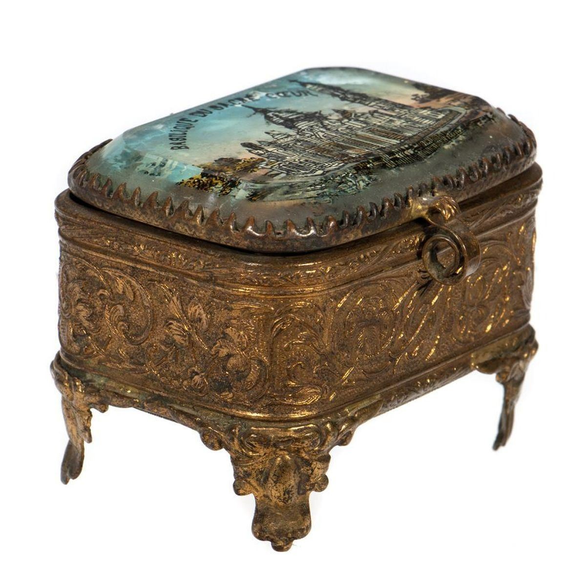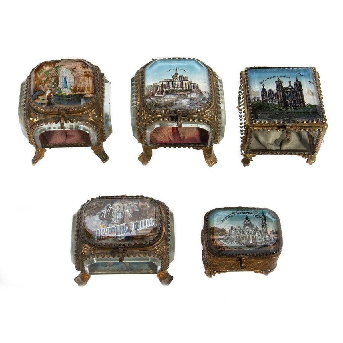 Five Beveled Glass and Ormolu Caskets, the tops painted with images of Lourdes, Fatima, and Cathedrals. Greatest height 3in. Condition: All very good.