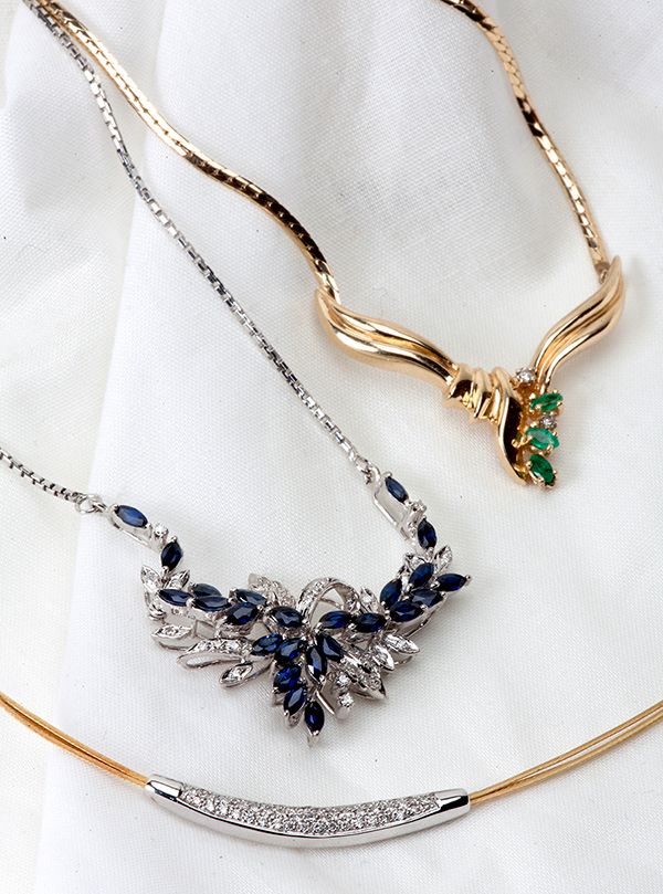Collection of Gemstone & Gold Necklaces. Including one 18k yellow gold 3 wire choker necklace with a center section of pave set round full cut diamonds, weighing a total of approximately .35 carat, gross weight 9.60 grams; one diamond, emerald, 14k yellow gold necklace, gross weight 10.60 grams and one sapphire, diamond floral design necklace, gross weight 10.50 grams.