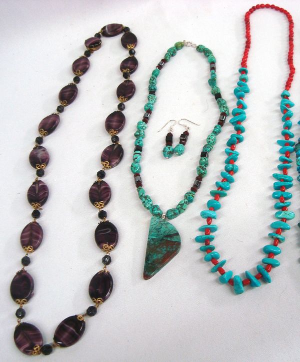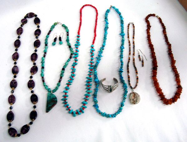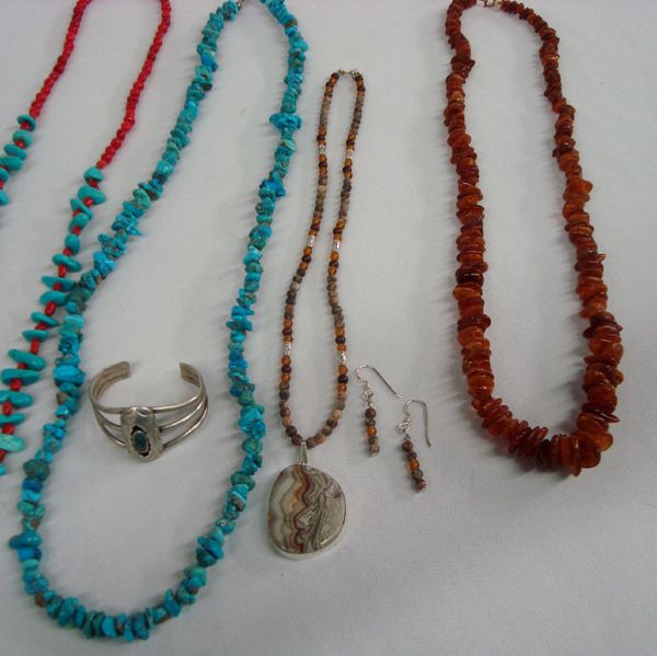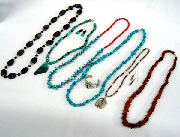 Collection of Gemstone Jewelry, #1 Lace Agate Pendant Necklace and earrings (.75''L) by Sally Rocks, hallmarked, measures 18'' end to end and pendant 1.25'' x 1'' #2 Block Turquoise Nugget necklace, measures 30'' end to end #3 Turquoise Nugget necklace, measures 29'' #4 Onyx, Hemitite, Garnet, Turquoise nugget necklace and earrings (1'') with turquoise pendant (2'' x 1'') necklace (19'' end to end), #4 Amber necklace, measures 24'' end to end #5 West German Purple Swirl and Faceted Bead Necklace, marked West Germany, measures 31'' end to end #6 Navajo Silver Turquoise Shadowbox Style Child's Bracelet, 3 band, 4.5'' inside measurement which includes gap x 1.25''W