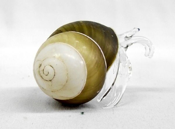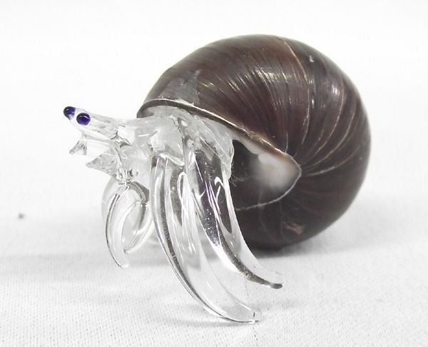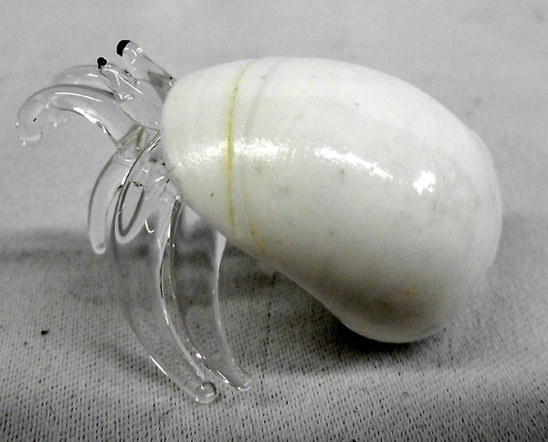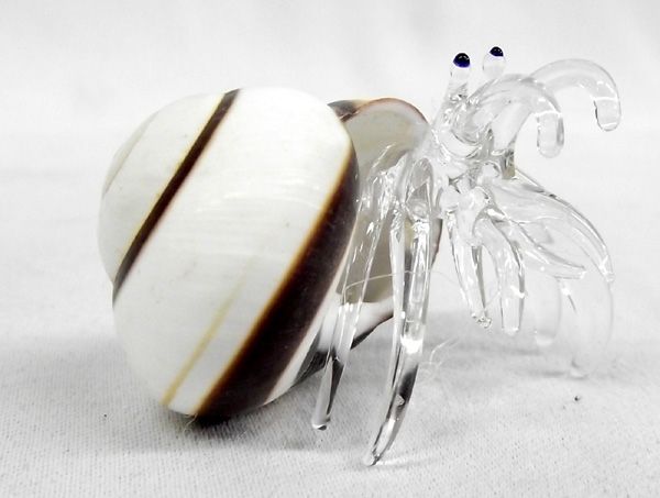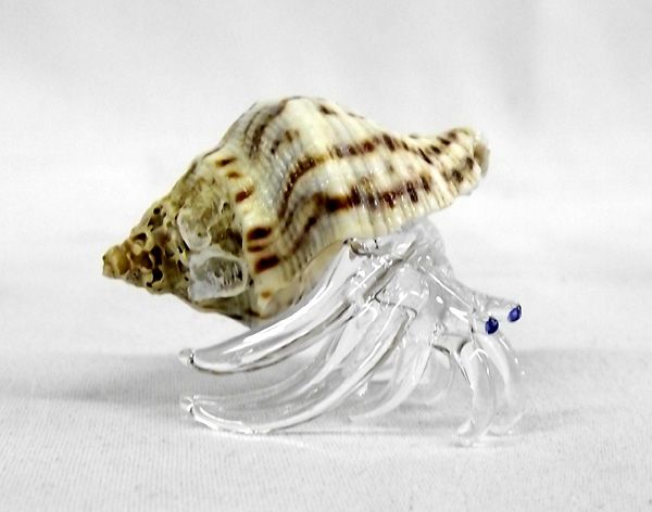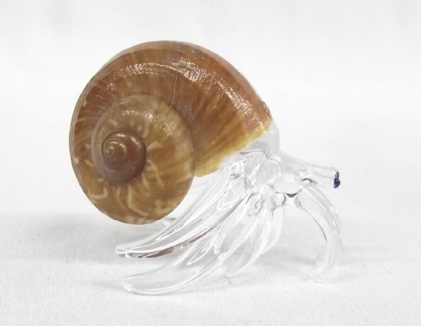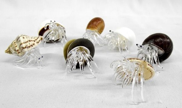 Collection of Glass and Shell Hermit Crabs, what lovely little cast of crabs - 7 to be exact, unique idea and each in their very own shell, shells include: baby ear, button, rock snail, and turban shells, measure 1''H x 1.75''L