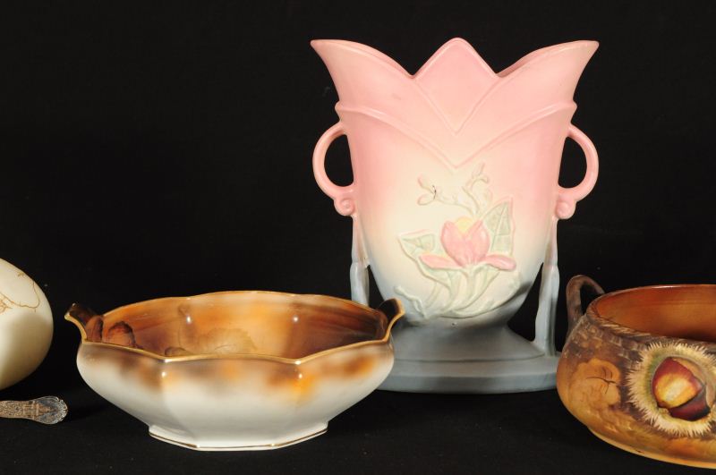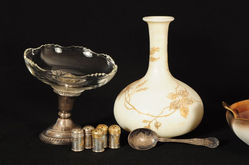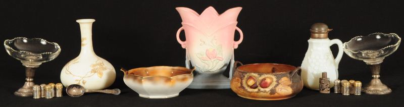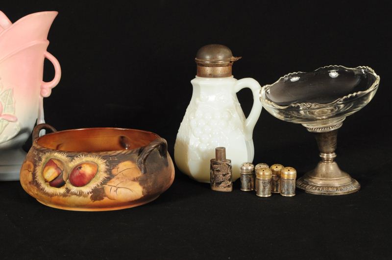 Collection of Glassware, Pottery, & Sterling Silver Footed Glass Bowl & Salt/Pepper Shakers. Includes Decorative Pottery Piece Marked "Hull". Largest Measures 9" Tall