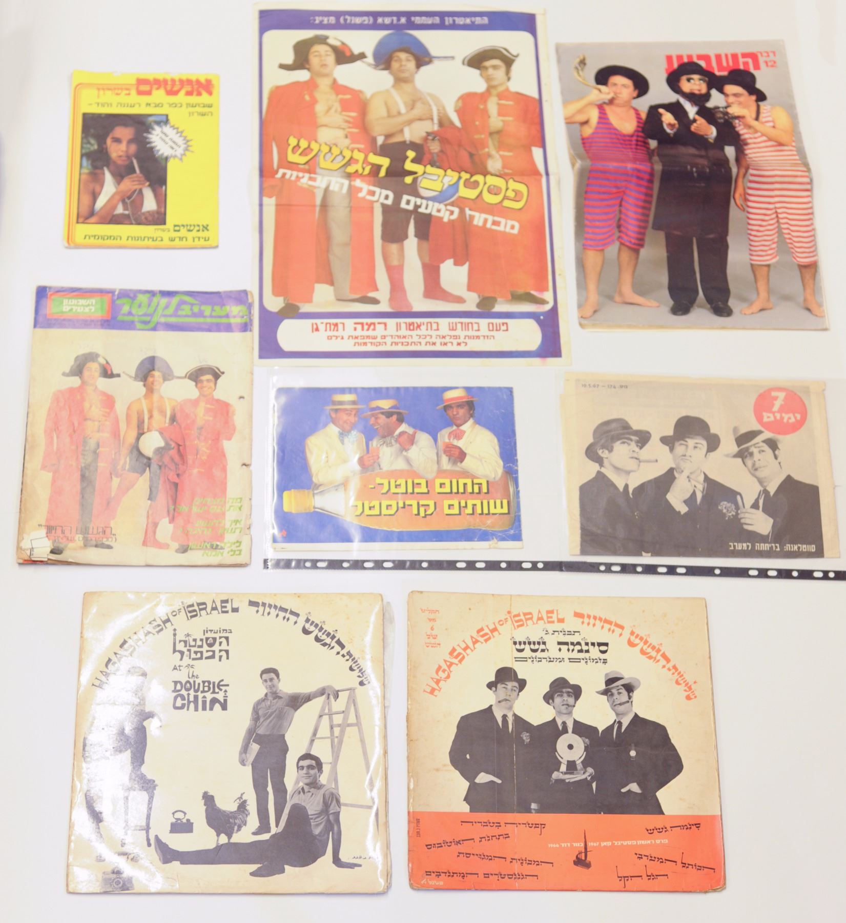 Collection of Hagashash Hachiver items, 1970s-1980s, includes: 3 newspaper advertisements, 2 newspapers with news reports, a poster and 2 uncommon vinyls: the Hagashash Hachiver group in the Double-Chin club, Hagashash Hachiver group, show no. 3, Cinema Gashash tunes and skits. Reasonable-good condition: timeworn.