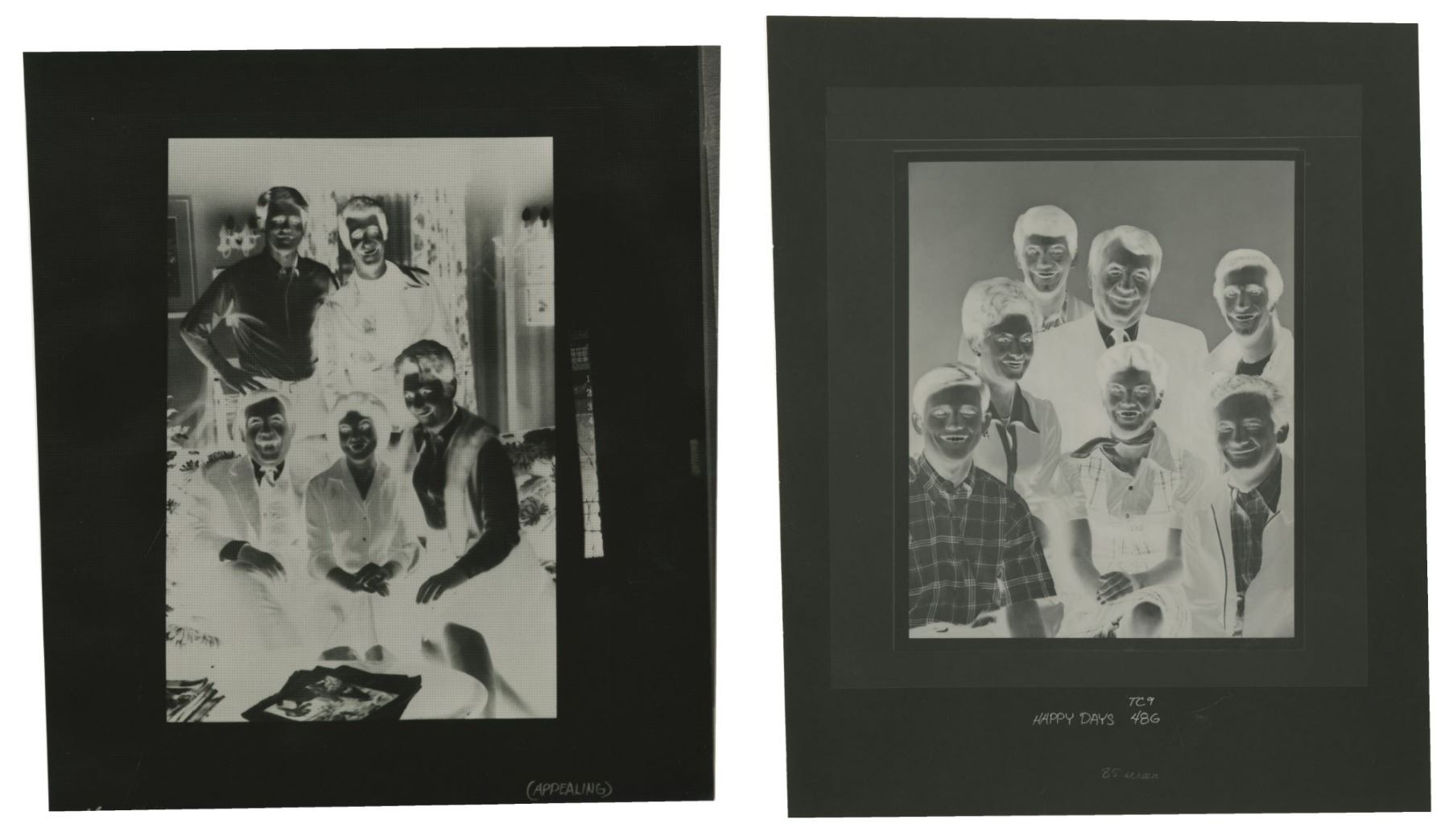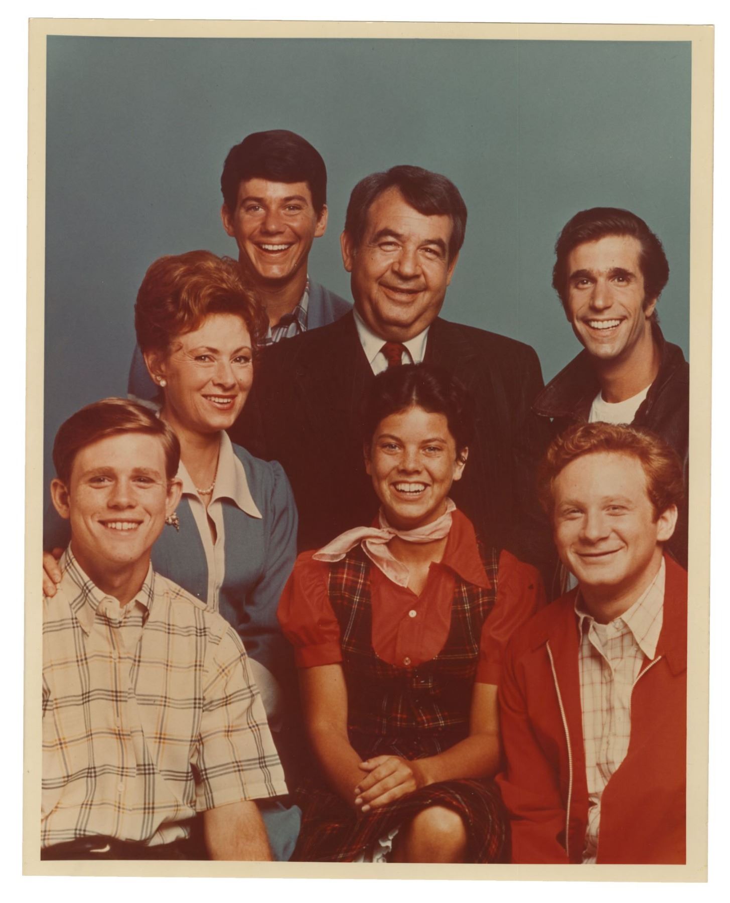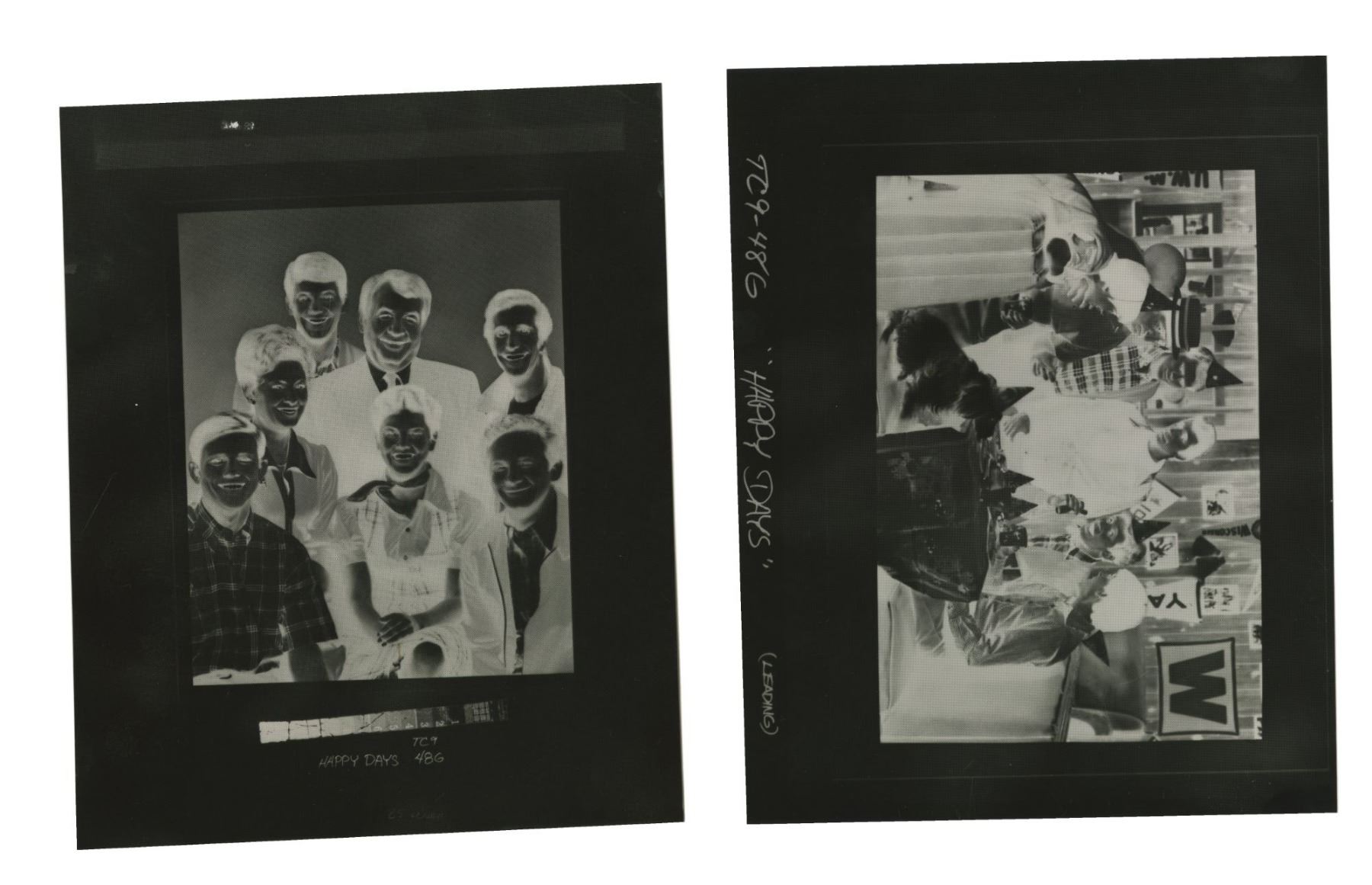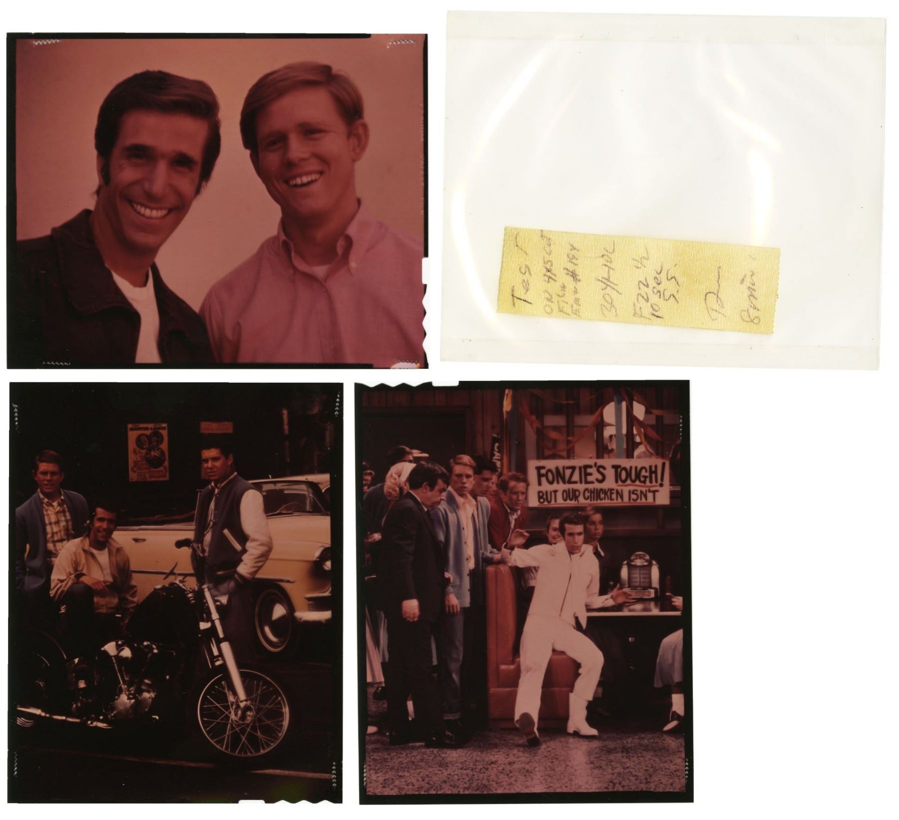 (Paramount, c.1970s) A large collection of slides and photos from the iconic television show "Happy Days". This collection features a great assortment of candid imagery as well as publicity images, and includes: (39) slides, (5) small color transparencies, a color negative, (5) black and white negatives, (6) larger black and white negatives, and a color print. The images range in size from 4"x5" to "10"x8". The condition is very good overall with some wear from use.