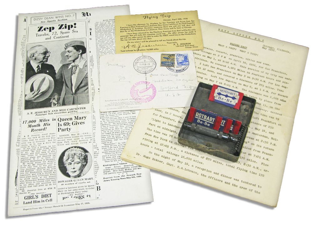 Collection of items relating to the Hindenburg airship, including a shaving kit recovered from the 6 May 1937 Hindenburg Disaster, which occurred as the famous commercial transatlantic airship caught fire, crashing and burning during its attempt to dock with its mooring mast at the Lakehurst Naval Air Station. Lot includes: (1) a gentleman's travel razor housed in original metal case, with spare blades. Case measures 3.25'' x 2'' x 1.25'' with charring as it was recovered from the wreckage by a firefighter according to Bonham's. (2) Printed manuscript written and signed in facsimile by frequent airship traveler A.E. Jessurun, headed ''News Letter No. 2. / Flying Trip / What a Trip! What a Trip!'' Document details his impressive air trip that commenced on 30 April 1936 in Chicago, and continued on Chicago-San Francisco-Los Angeles-Newark-Lakehurst and then, aboard the ''Hindenburg,'' to Frankfort, Germany, arriving on 13 May 1936. He then returned to the U.S. successfully on 20 May 1936. Jessurun details his experiences on his flights aboard the ''Hindenburg,'' including a conversation with Dr. Hugo Eckener, commander of the flight, and also details a prophetic incident as the ''Hindenburg'' returned to Lakehurst, ''...for a moment I experienced the sensation of falling through space, when as abruptly everything seemed righted and we were flying along smoothly. Upon inquiring, I found that one of the men in the Control Room had accidentally pulled the wrong lever causing the Airship to go down, but had discovered his error immediately. The passengers remained very calm, and the Captain assured them there was no danger...'' 10pp. document measures 8.5'' x 11'' with some dampstaining to last four pages, and a loose last page. (3) A second printed manuscript signed ''A.E. Jessurun'' in ink on a 5.5'' x 3.25'' card. Dated 30 April 1936, document is titled ''Flying Trip'' and reads in part, ''I leave this afternoon by Airplane for San Francisco to New York and from Lakehurst, New Jersey I will fly on the Graf Zeppelin Hindenburg to Frankfurt, Germany remaining there one and one half days and then fly on the Hindenburg to Lakehurst, New Jersey and fly back to Chicago...'' (4) A postcard depicting ''Sleeping Cabin in the Airship 'Hindenburg''', addressed to a Mrs. Van Eiff, Spofford, and postmarked 11 August 1936 aboard the Hindenburg. With N.H., U.S.A., German Airship and Airmail stamps, and with two additional postmarks, 11 August 1936, noting it was flown by airship, the other, depicting an airship approaching North America, captioned ''German Airmail Europe-North America.'' Postcard measures 5.75'' x 4''. (5) Lastly includes three articles about Jessurun's flights reprinted together on one 7.5'' x 14'' sheet, from the Newark ''Evening News'', dated 8 May 1936, ''New York Journal of Commerce'', dated 23 May 1936 and ''Chicago Herald & Examiner'', dated 27 May 1936. Overall, very good condition.