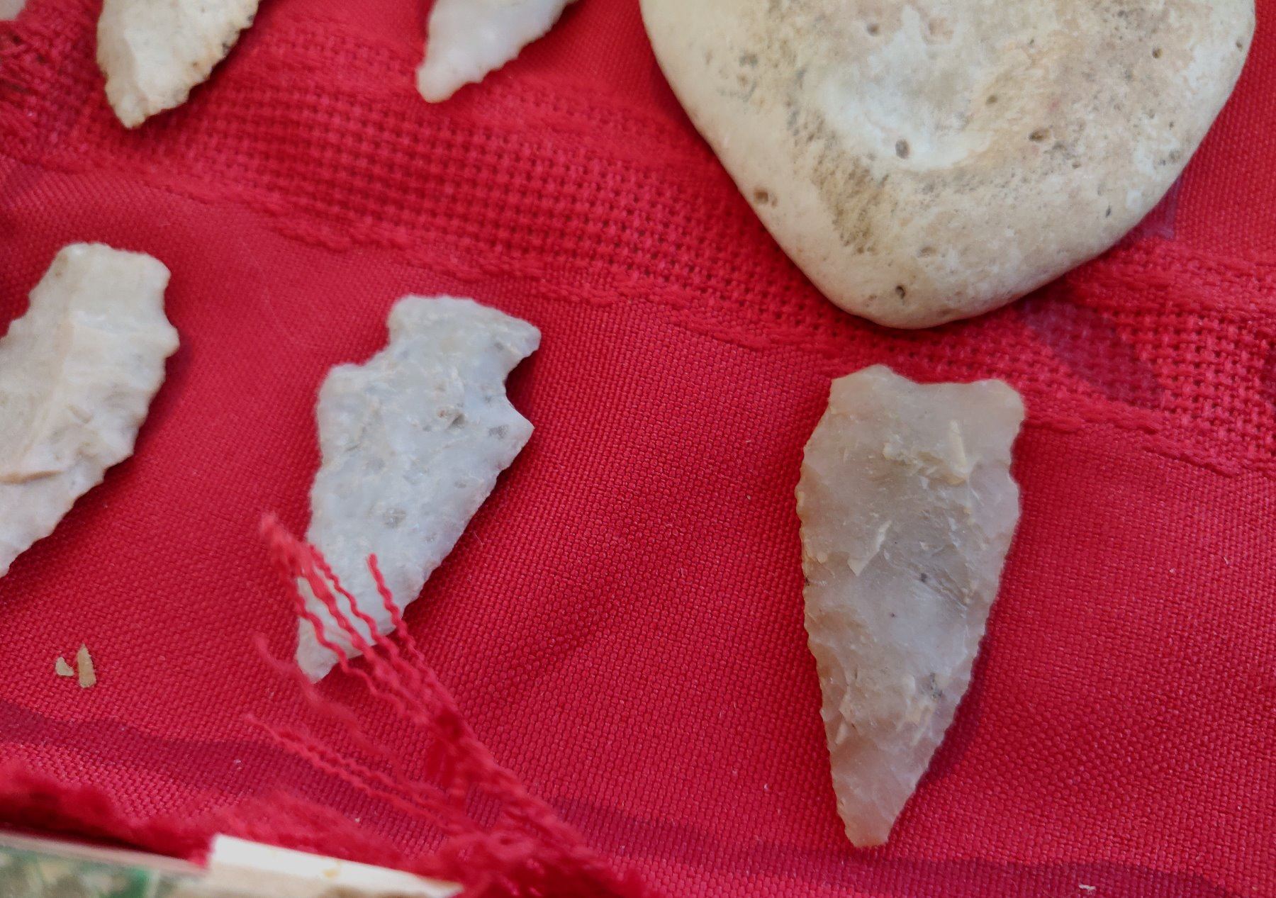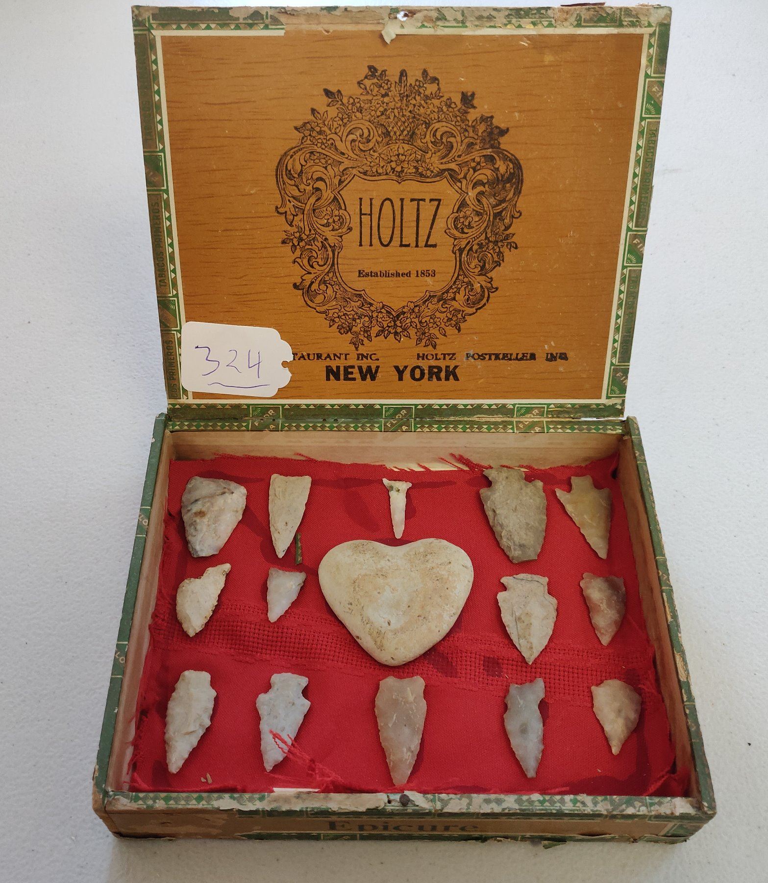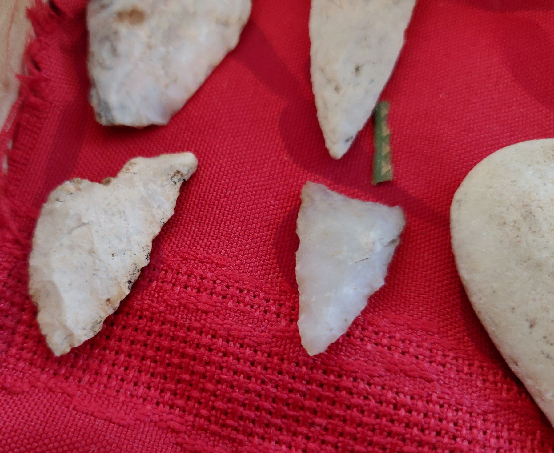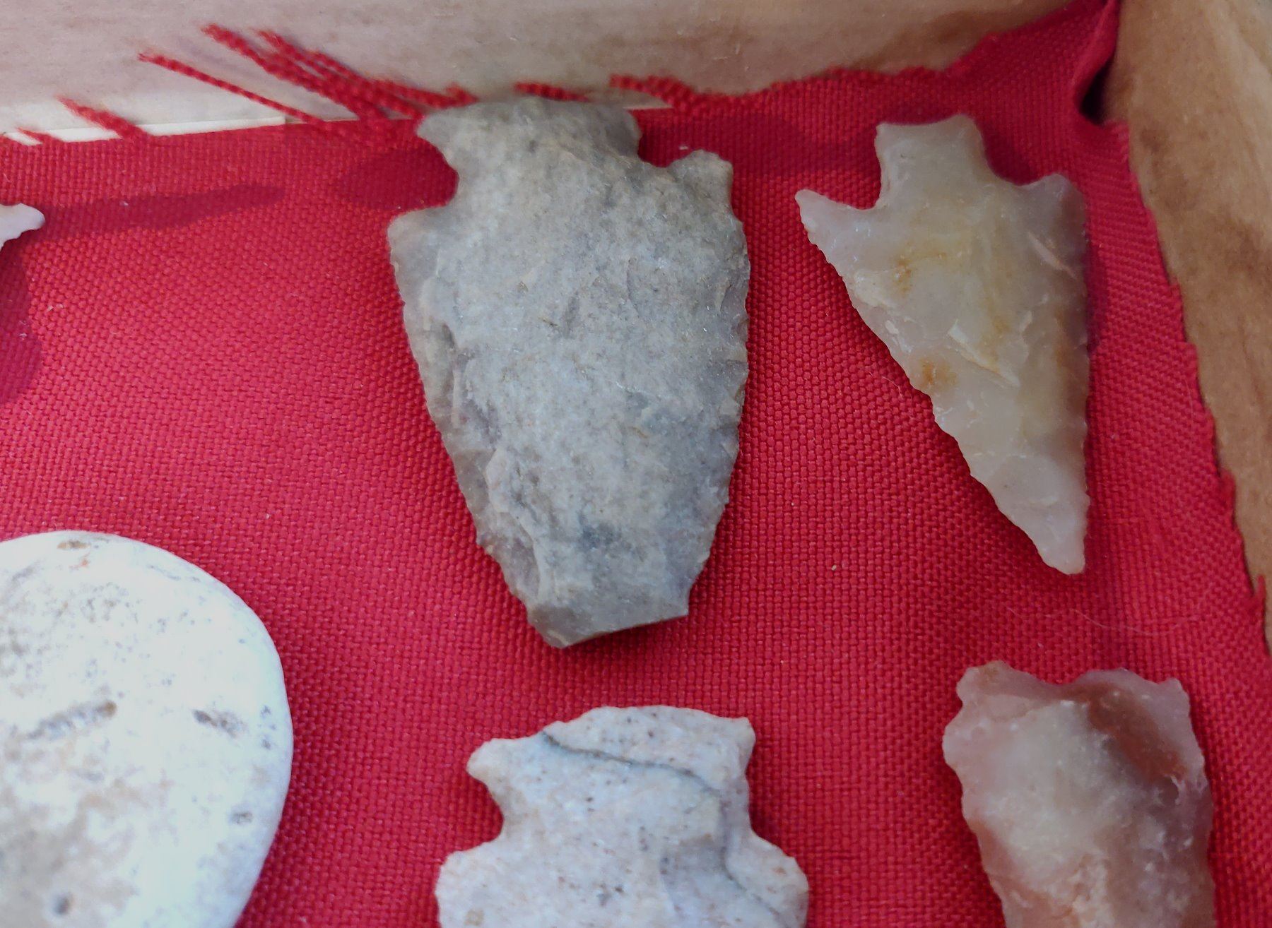 Collection of Hohokam Artifacts, pre-historic items. Made of chert, the largest item measures 2 1/2". Ajo, Pima County, Arizona. Box included. Condition: As found, see images. Shipping: $21.00 w/insurance and signature, due to value.