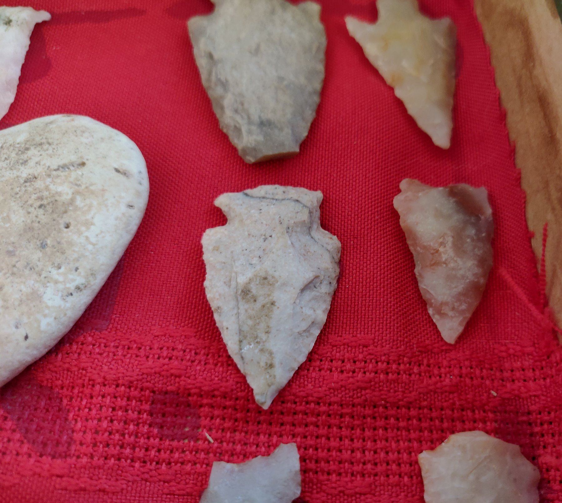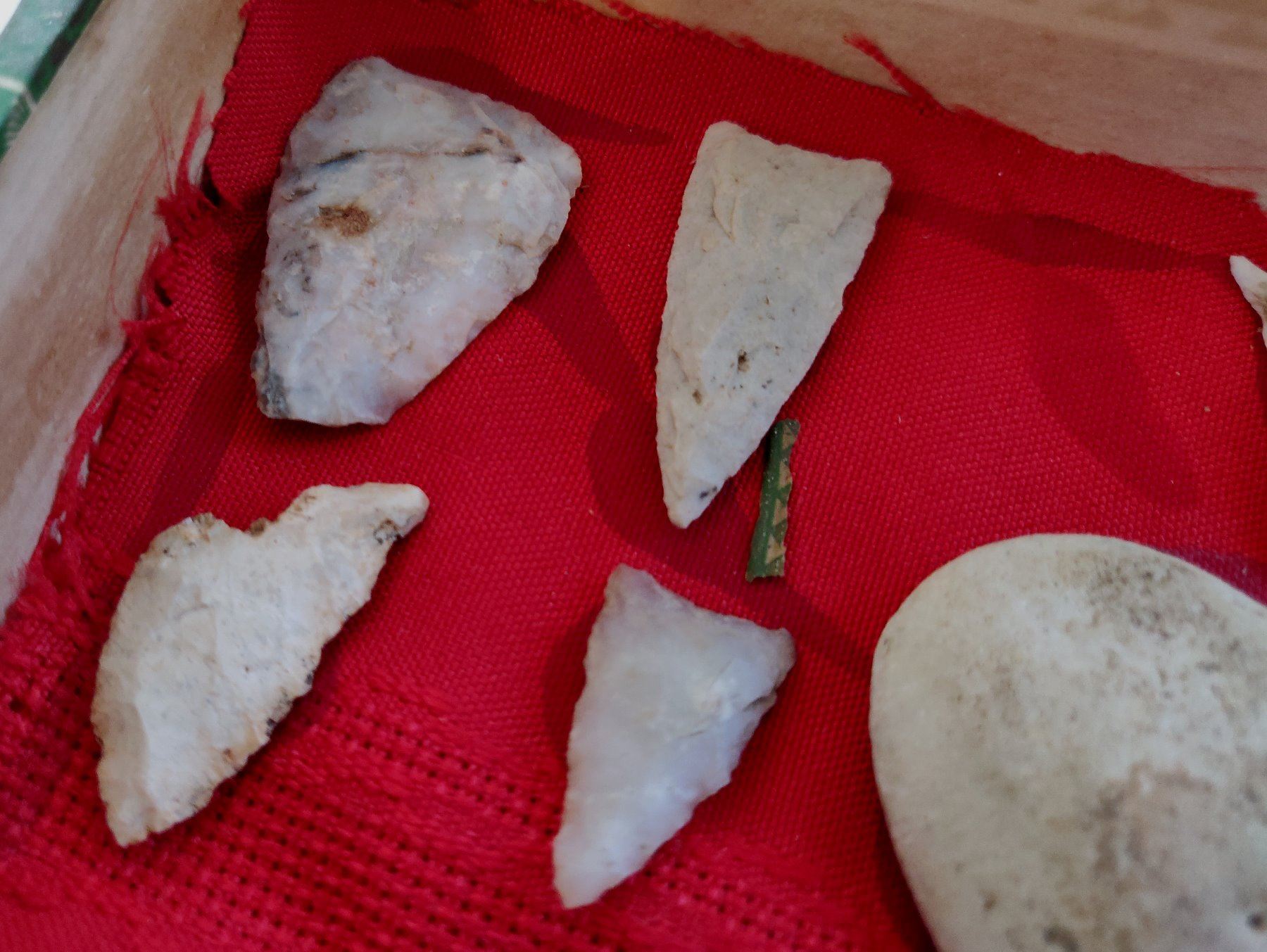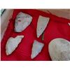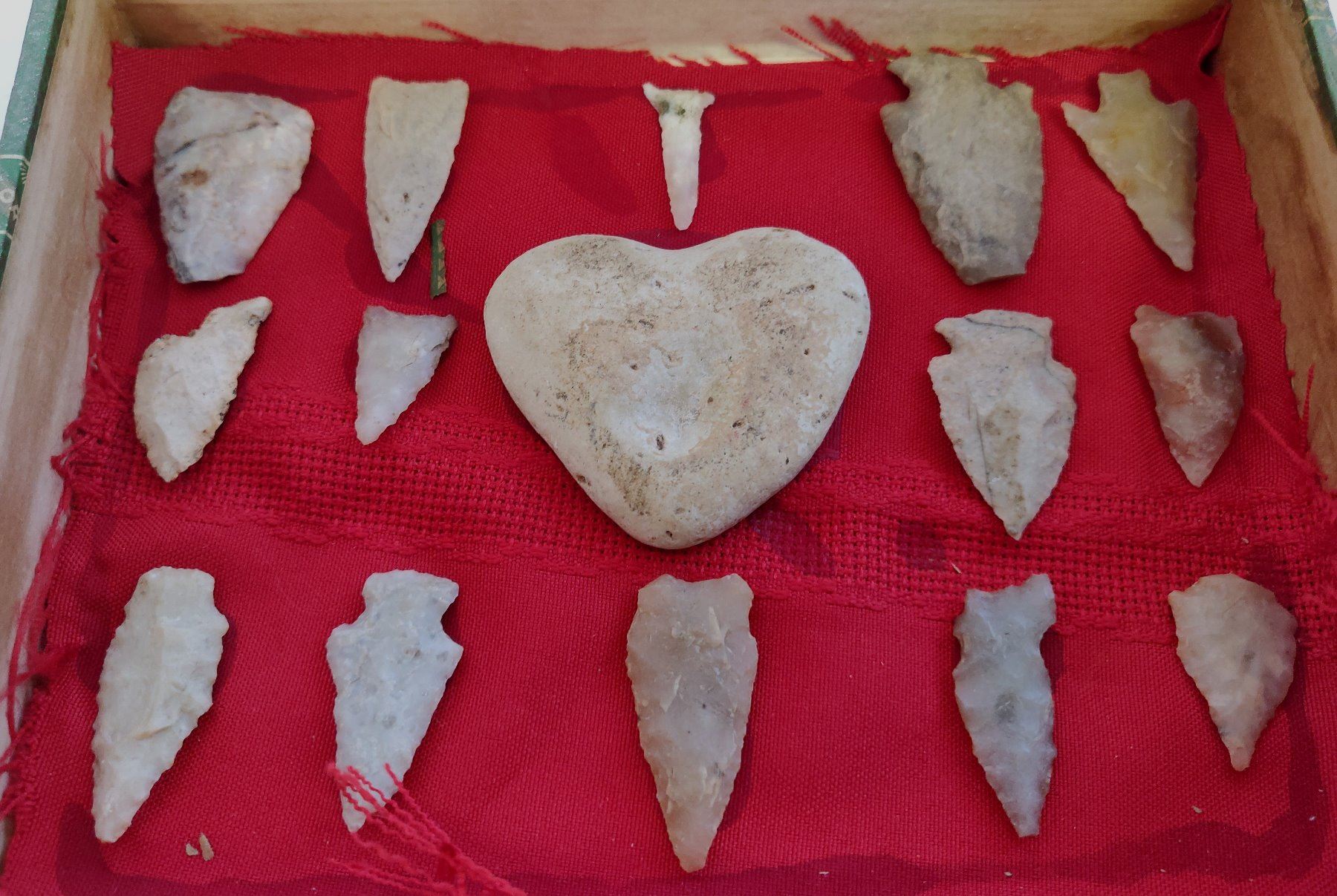 Collection of Hohokam Artifacts, pre-historic items. Made of chert, the largest item measures 2 1/2". Ajo, Pima County, Arizona. Box included. Condition: As found, see images. Shipping: $21.00 w/insurance and signature, due to value.