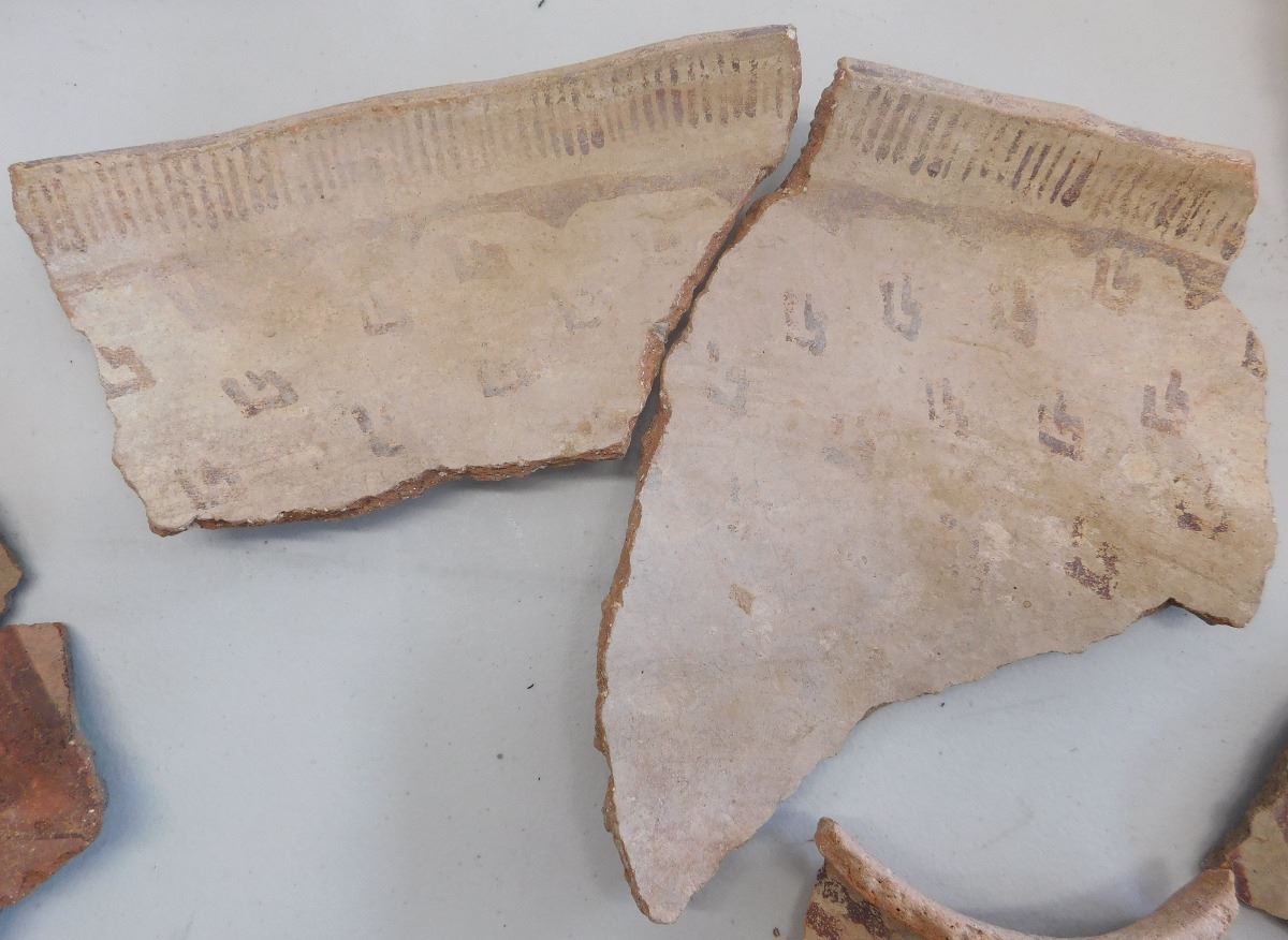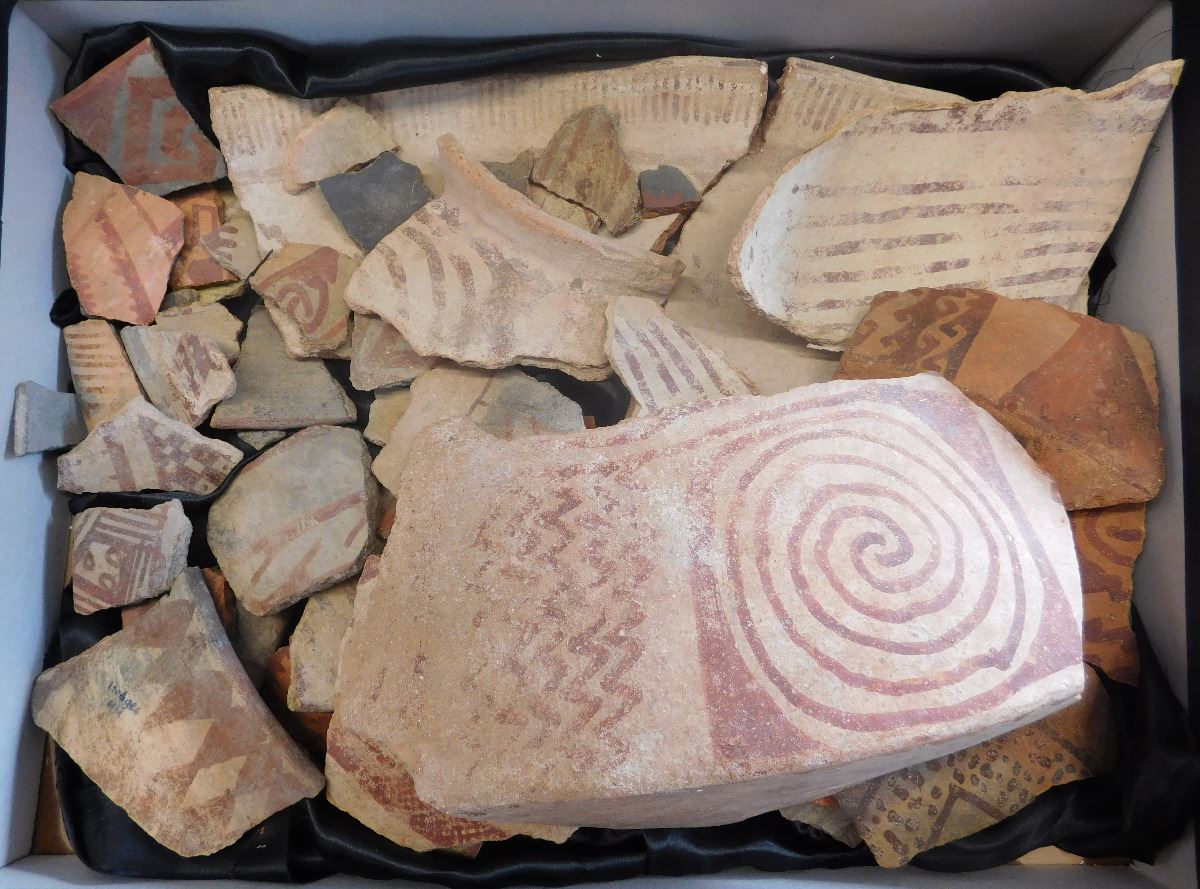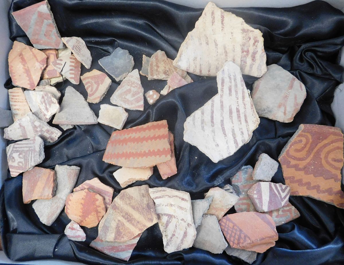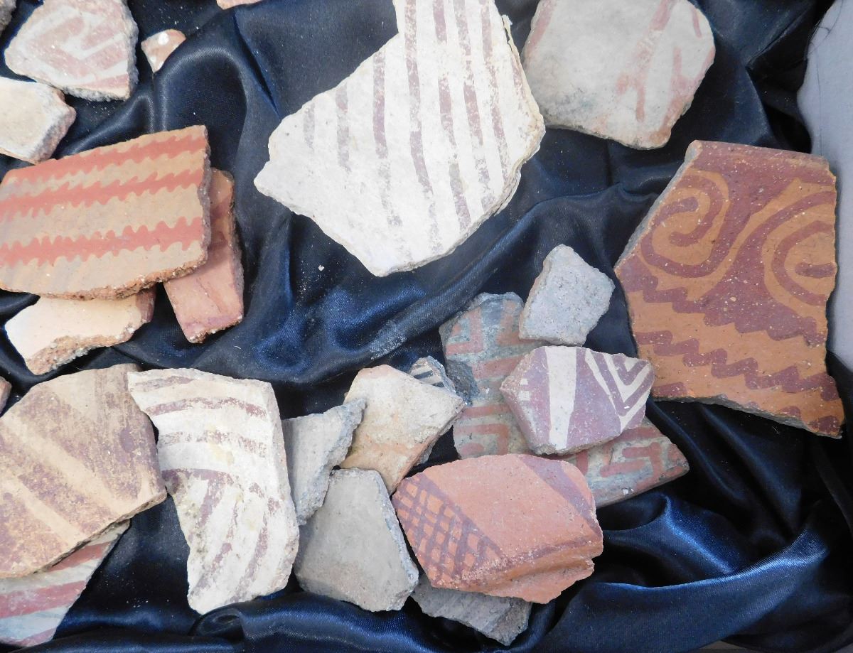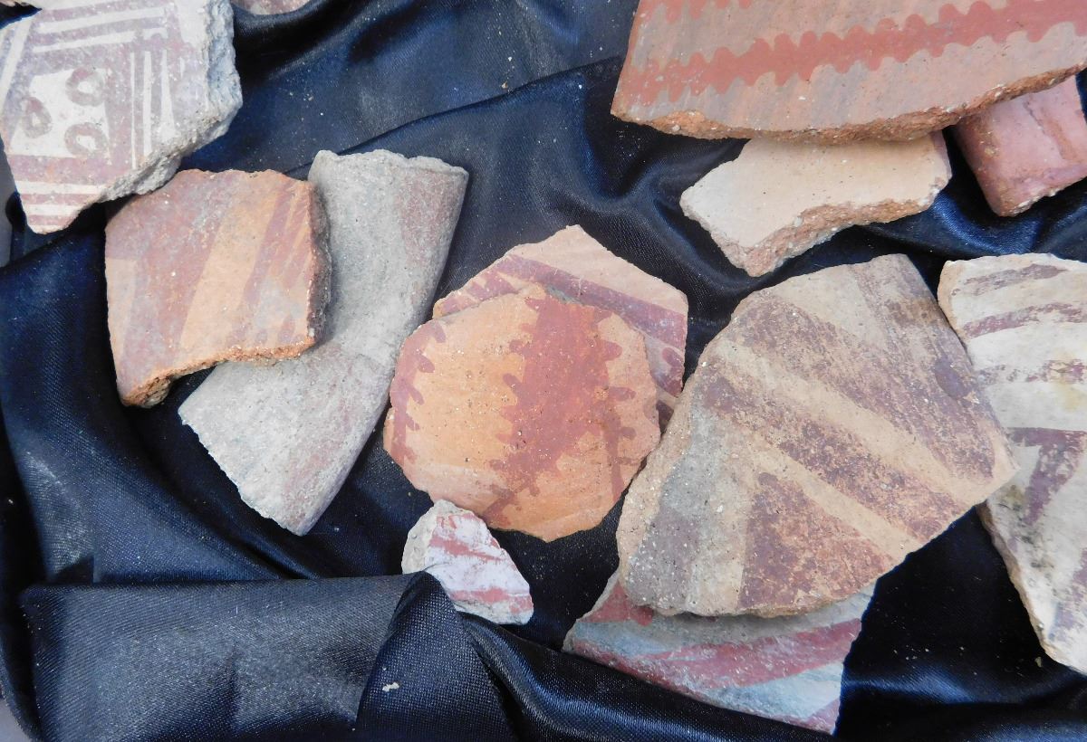 Collection of Hohokam Pottery Pieces, pre-historic items. Made of clay and paint, the largest piece is 9" x 4" and the smallest is about 2" x 2". From Tucson, Arizona. Classic Hohokam pottery shapes, nice design. Condition: All broken, as found, see images. Shipping: $25.00.