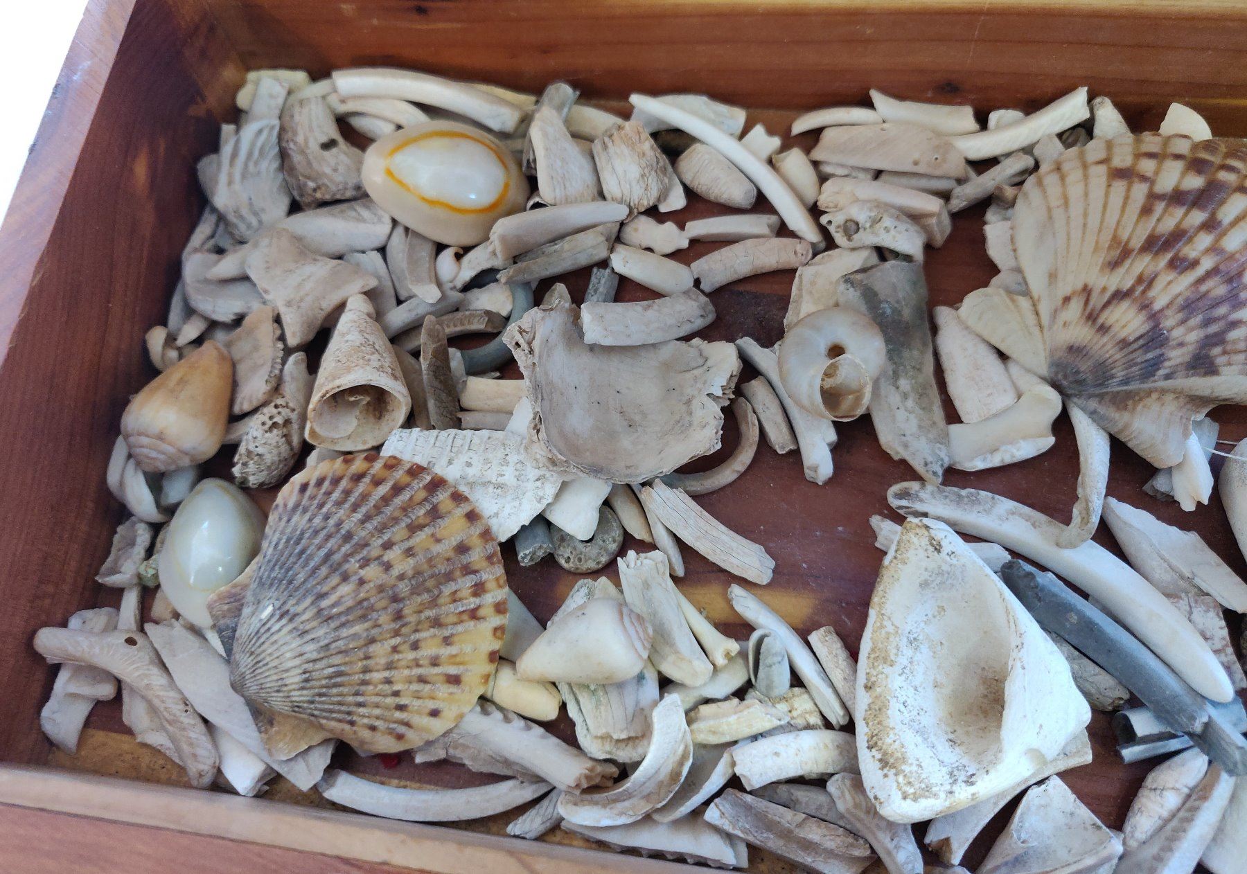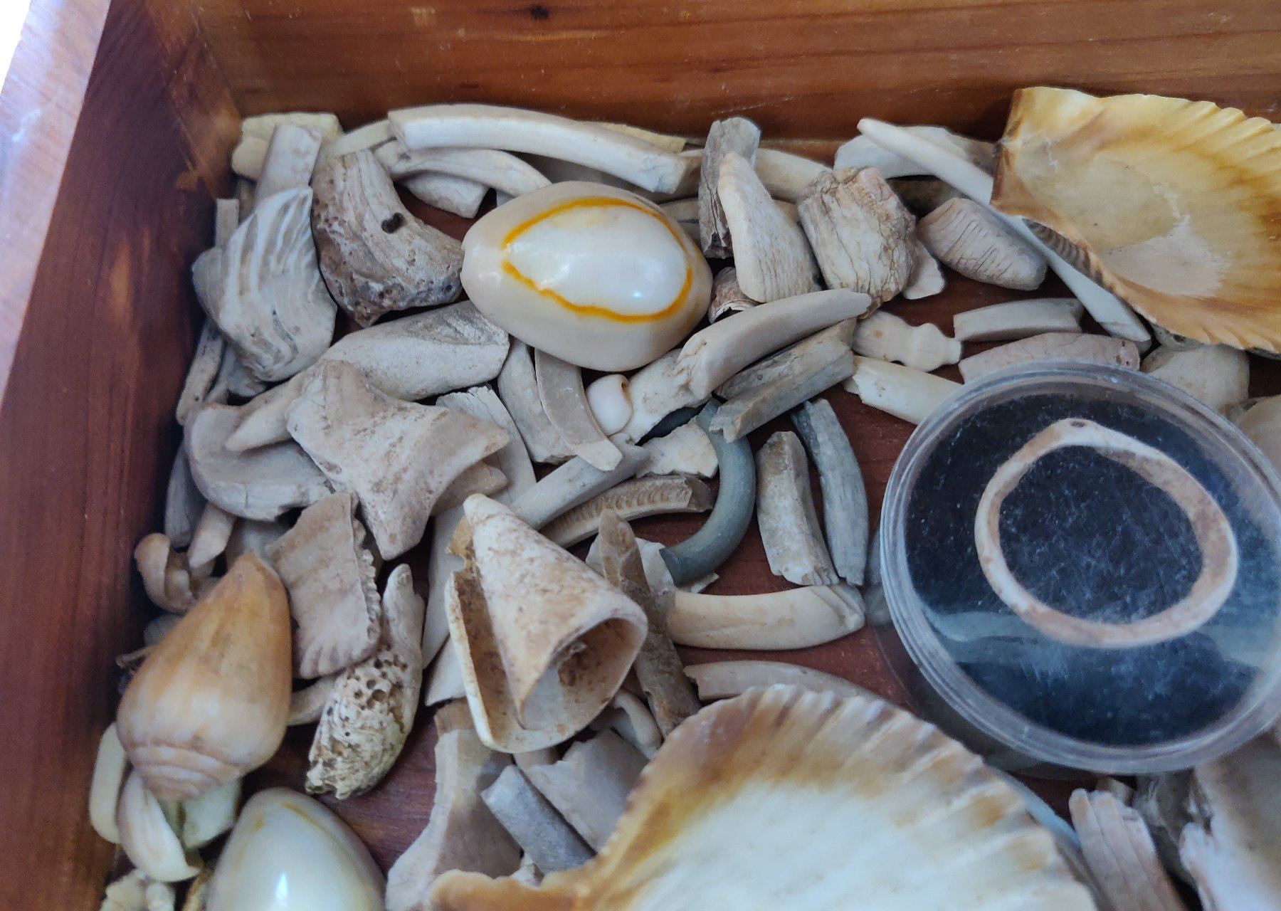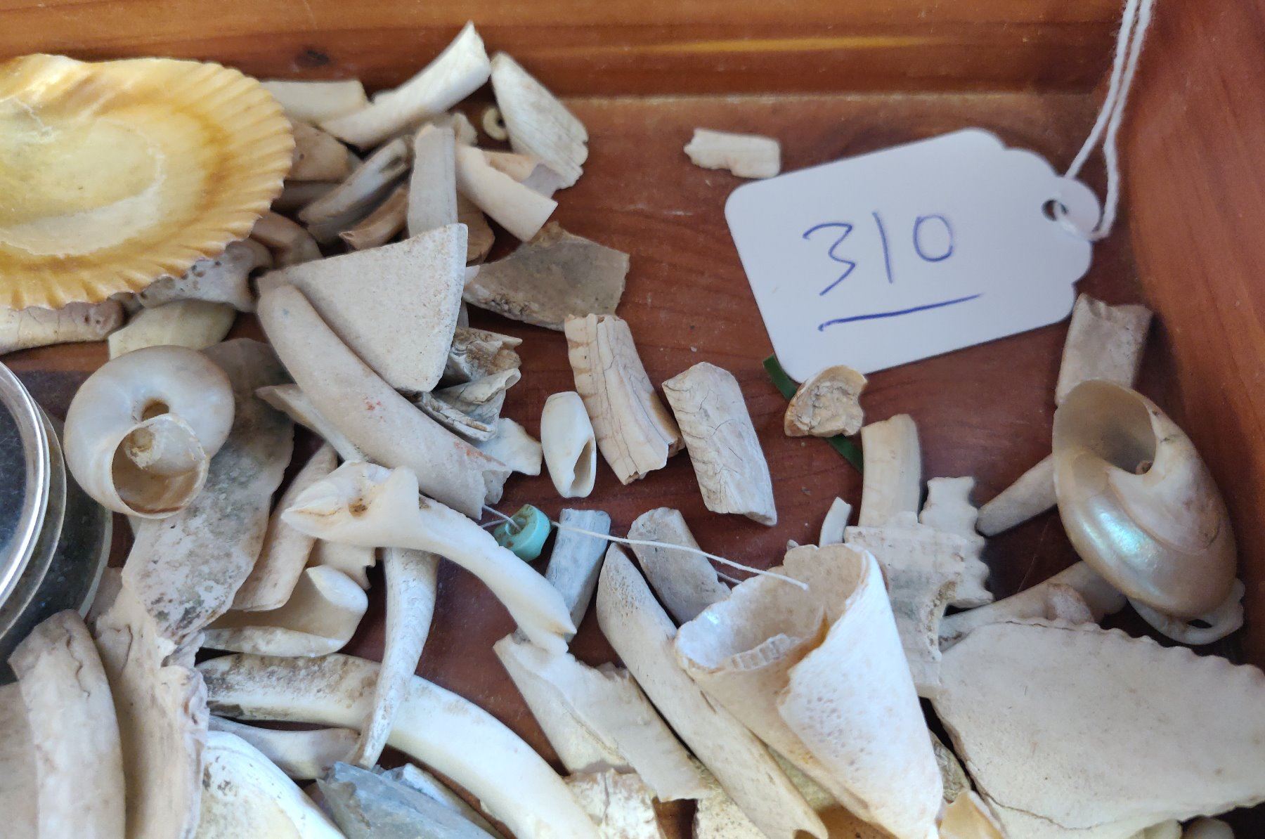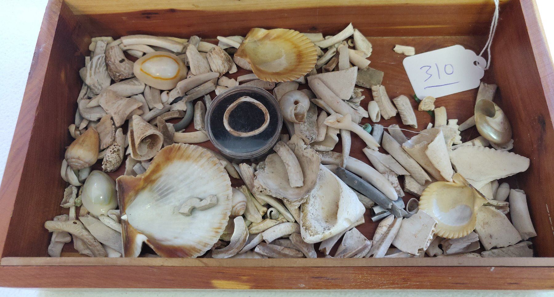 Collection of Hohokam Shell Artifacts, pre-historic items. Made of shell, the largest measures 2". Ajo, Pima County, Arizona. More than 100 items, box not included. Condition: Mostly broken, see images. Shipping: $18.50 w/insurance and signature.