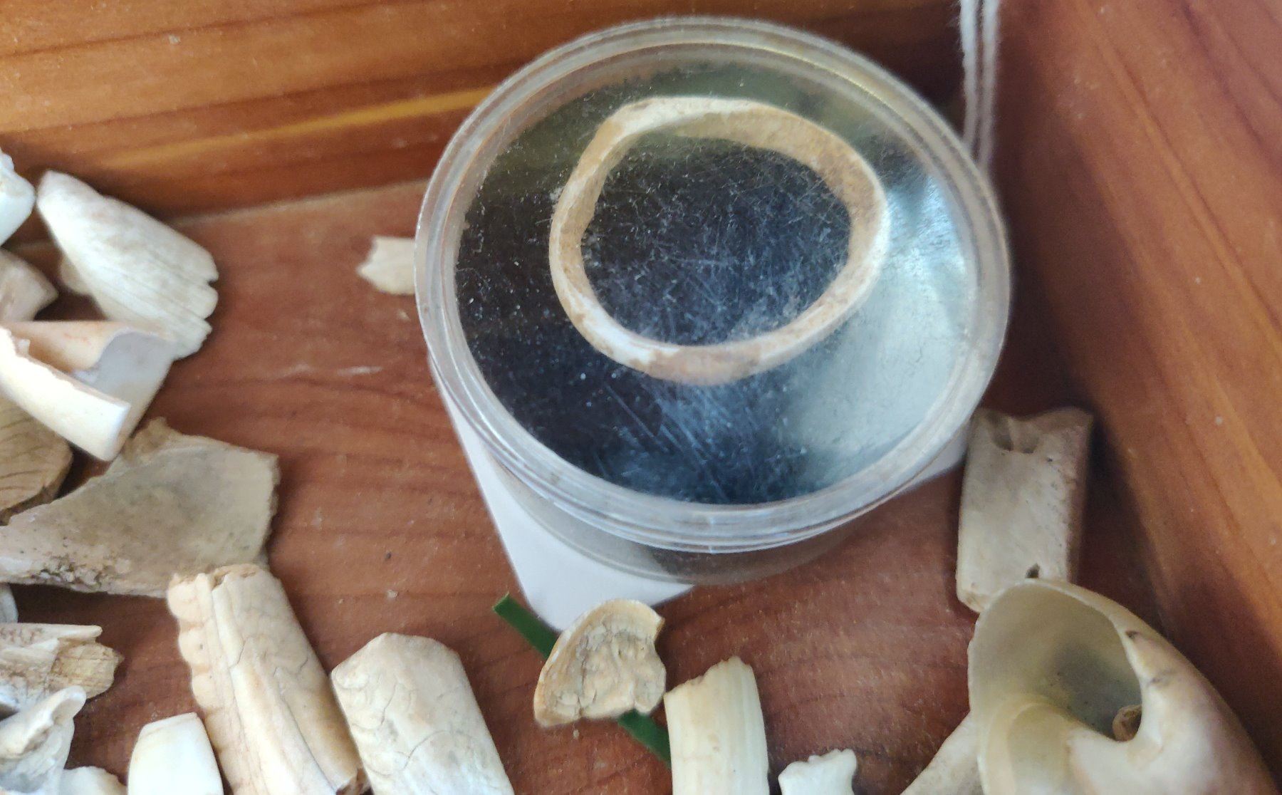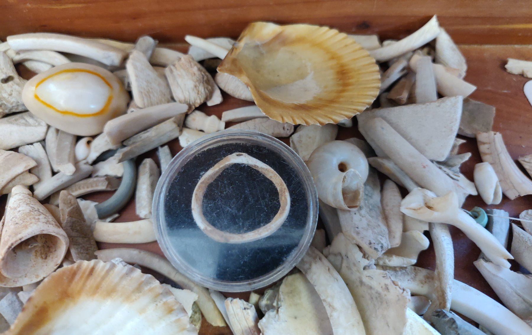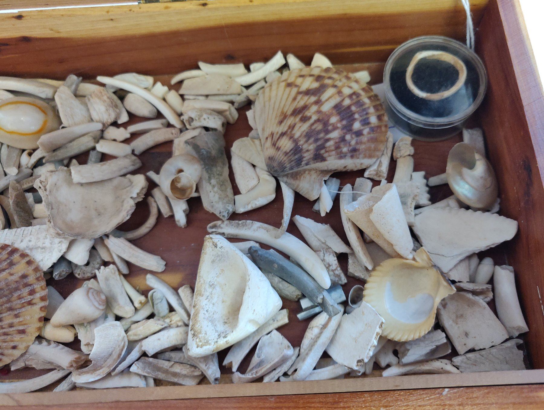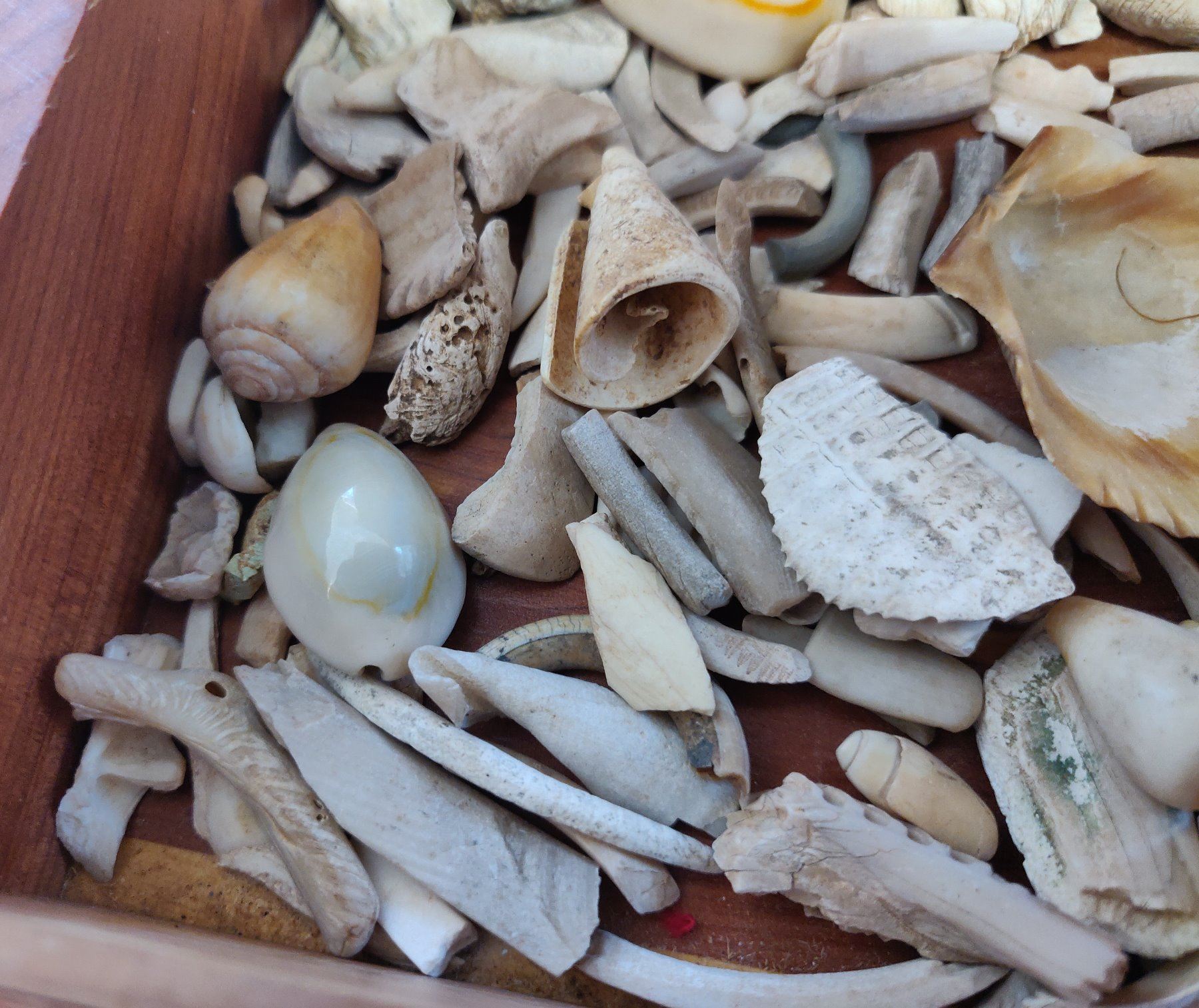 Collection of Hohokam Shell Artifacts, pre-historic items. Made of shell, the largest measures 2". Ajo, Pima County, Arizona. More than 100 items, box not included. Condition: Mostly broken, see images. Shipping: $18.50 w/insurance and signature.