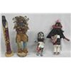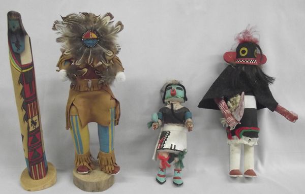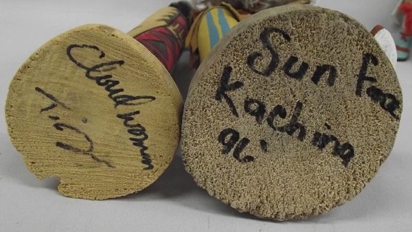 Collection of Hopi & Navajo Kachinas, largest measures 12.5''H x 2.5''W, 1) 1996 Sun Face 2) Harvest Kachina #3 Broad Face Ogre Kachina 4) Hopi Long Hair Kachina ''Cloud Woman'', signed on bottom by artist