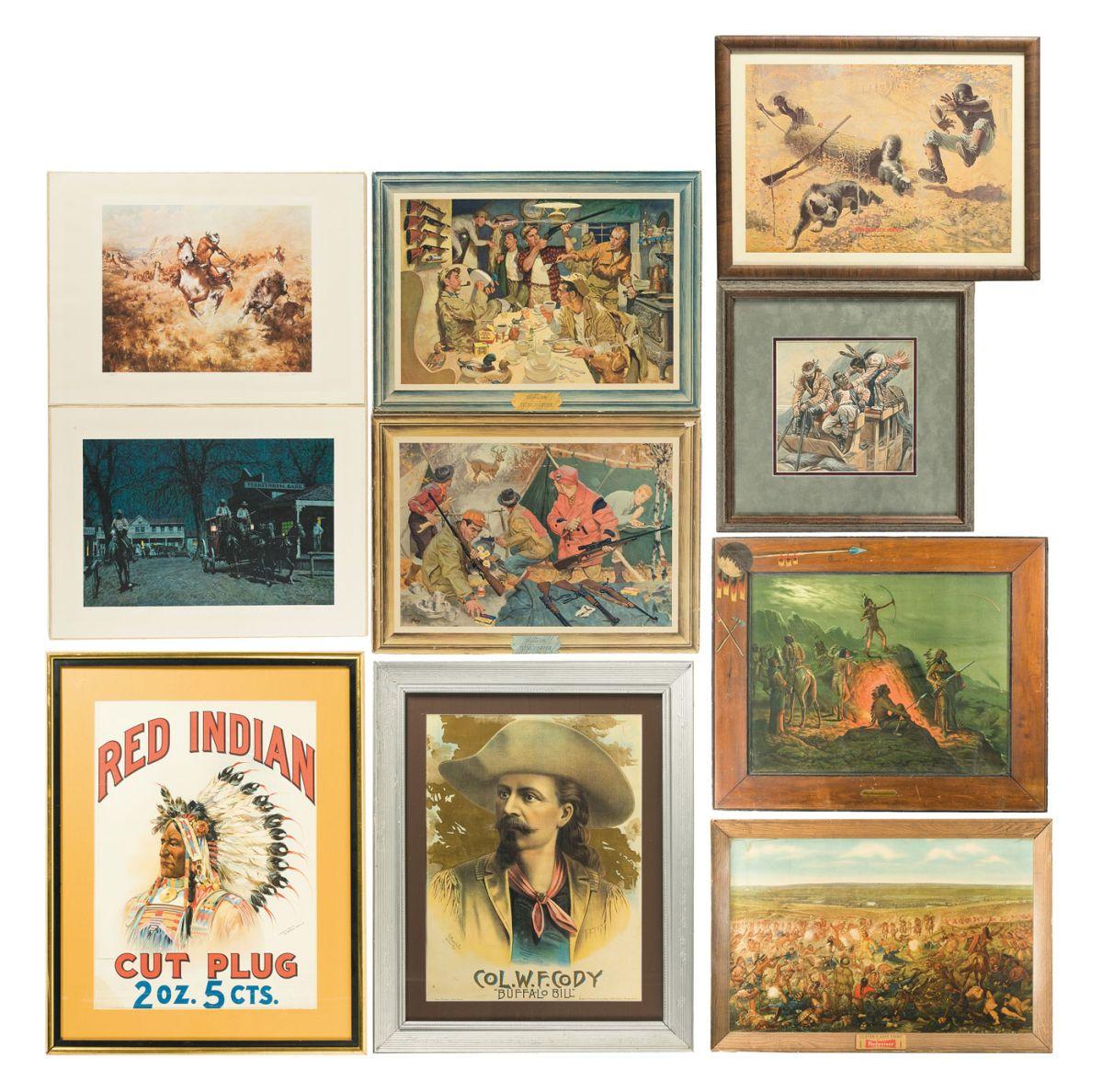 Framed: illustrated stagecoach robbery scene by unknown artist, Winchester/Western "Shoot Them and Avoid Trouble", Red Indian cut plug 2 oz. 5 cents, Buffalo Bill Museum reproduction of Col. Cody portrait, "Burning Arrow" (missing back). With Winchester/Western illustrated hunter's camp and cabin scenes, Donald Teague's "The Night Mall" and "The Great Hunt", and Budweiser's "Custer's Last Fight". Overall very good to fine.