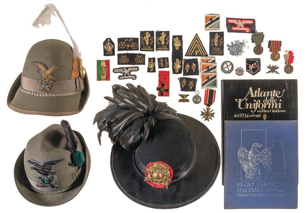 1) Book "Atlante delle Uniformi militari italiane dal 1934 ad oggi" 2) Book "Regio Esercito Italiano A XVI/XVII Ministero Della Guerra" 3) Approximately 29 assorted patches, pins and medals. 4) Alpini Major's hat with plume. 5) Alpini hat with plume. 6) Bersaglieri hat with plume.