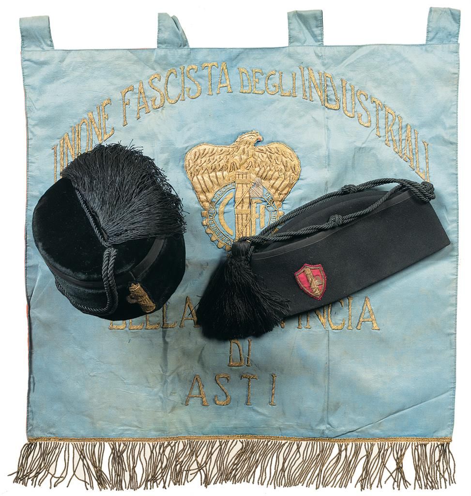 1)Italian Industrial Union banner, (very good with some stains, 2) Italian Fascist P.N.F. fez of the type worn by Mussolini and officials. Black velvet, (excellent). 3)Italian 1st style fez worn with appointment badge, circa 1925. Black wool, very good plus.