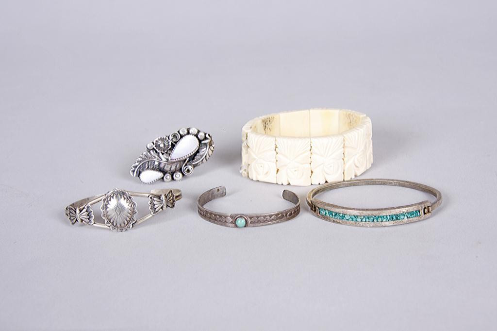 Collection of Jewelry Including a bone bracelet, three cuff bracelets, and a Native American sterlin