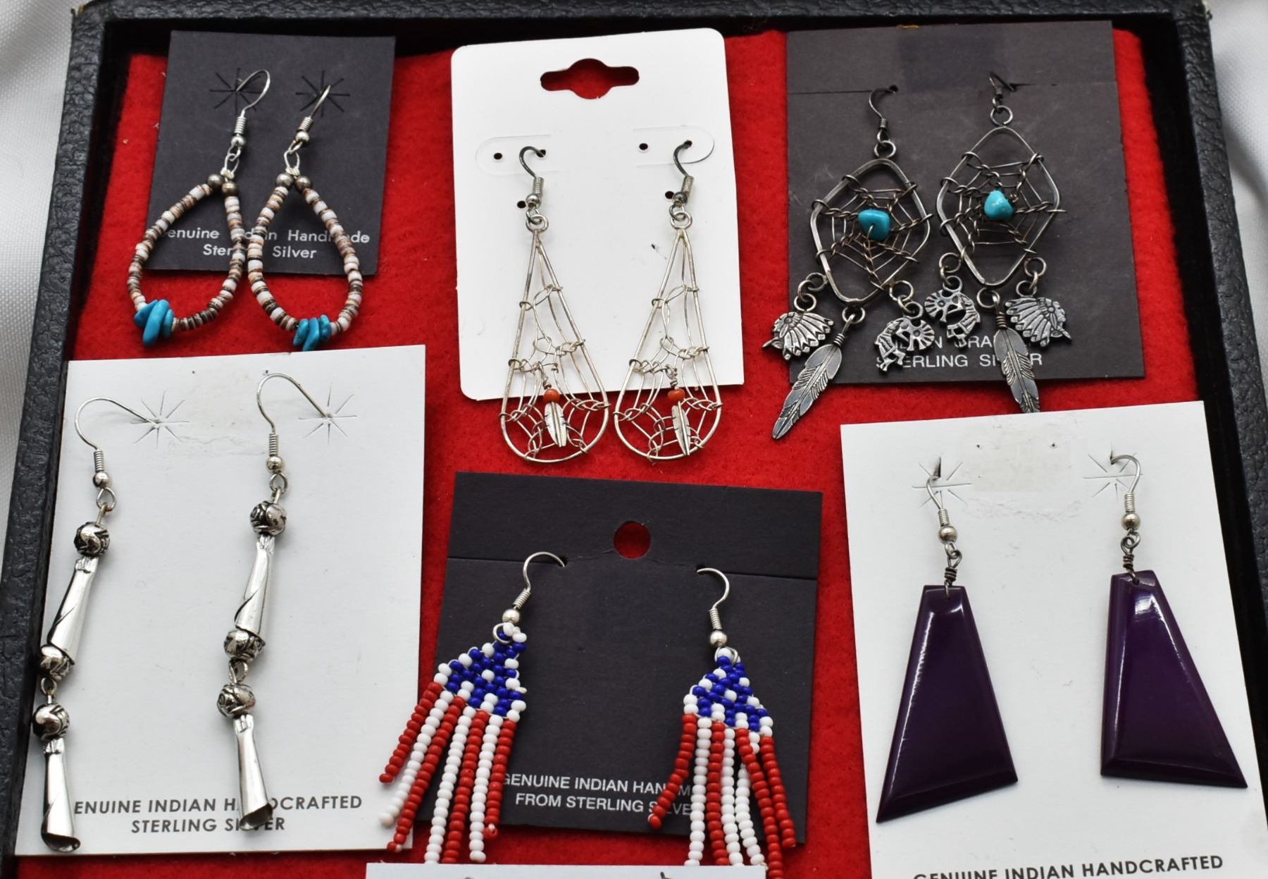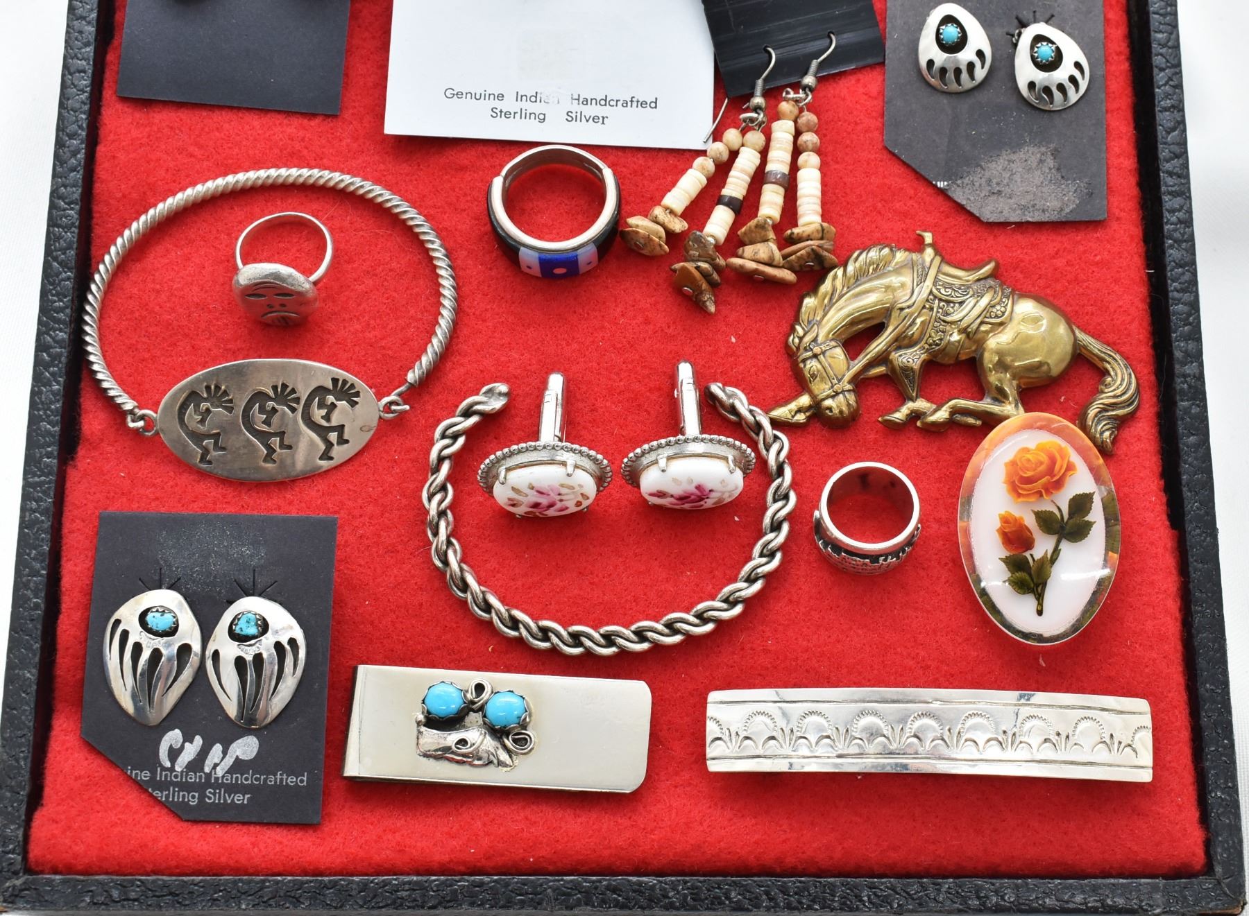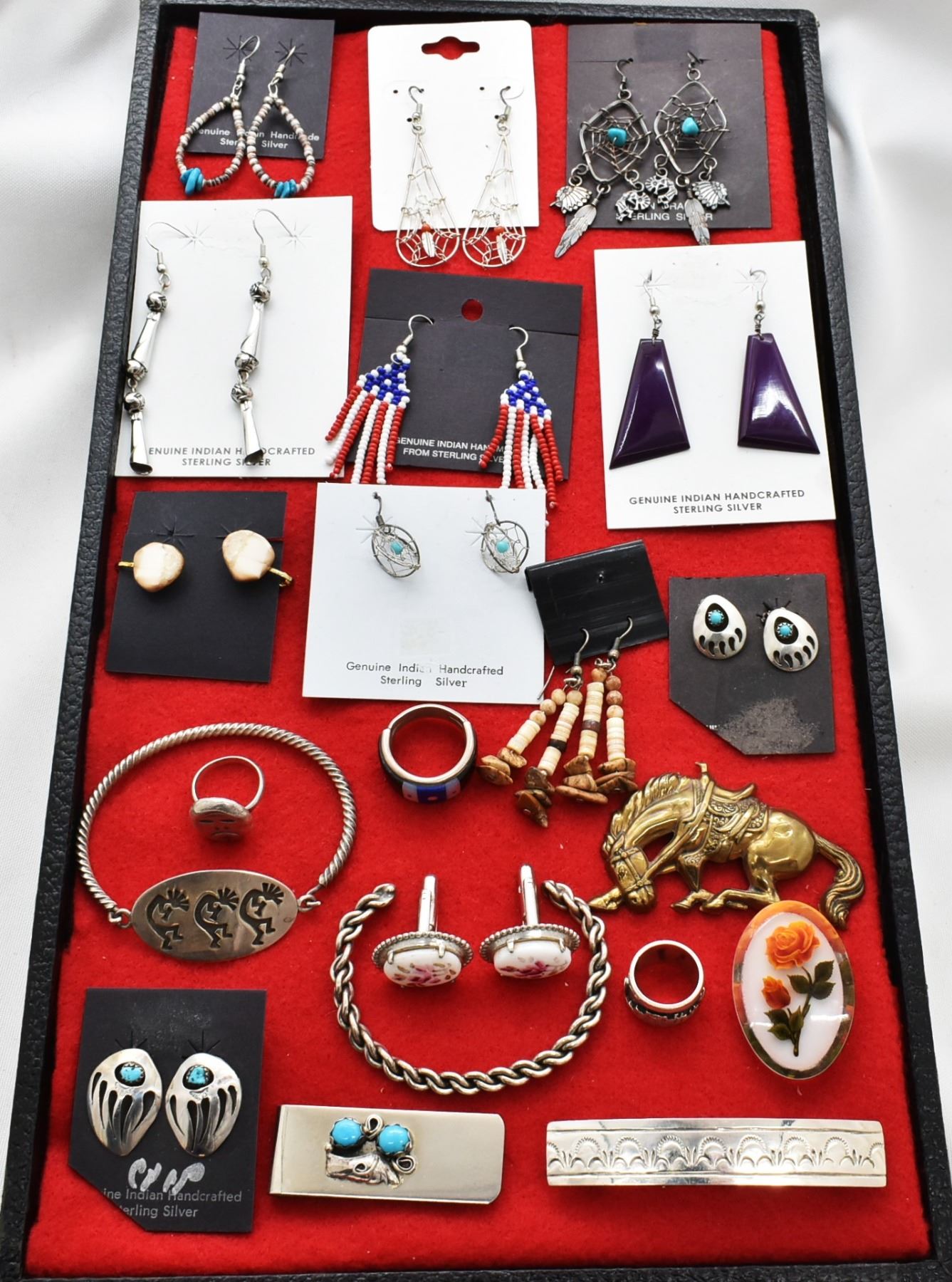 Collection of Jewelry, Most is Native American, includes 3 pairs of Navajo Dream Catcher Earrings, Navajo Patriotic Beaded Earrings, Santo Domingo Deep Purple Earrings, Navajo Silver Dangle Earrings (longest measuring 3'' which includes the wire), Navajo Shell Heishi and Turquoise Nugget Earrings, Northwest Coast Fossilized Ivory Leverback Earrings, Navajo Shell Heishi and Jasper Nugget Earrings, Navajo Turquoise Bear Paw Clip-On Earrings, Navajo Sterling Ring, Zuni Sterling Inlay Ring by Raymond Gasper (hallmarked and stamped sterling), Navajo Sterling Kokopelli Bracelet (stamped sterling), Porcelain Floral Cufflinks, Twisted Silver Rope Cuff Bracelet, Vintage Brass Horse Pin, Vintage Lucite Floral Pin, Navajo Sterling Storyteller Ring and/or Bead (stamped sterling, size 4), Navajo Sterling Barrette, Navajo Sterling Turquoise Money Clip (note that clip itself is not sterling however the leafwork on top is), Navajo Turquoise Bear Paw Clip-On Earrings