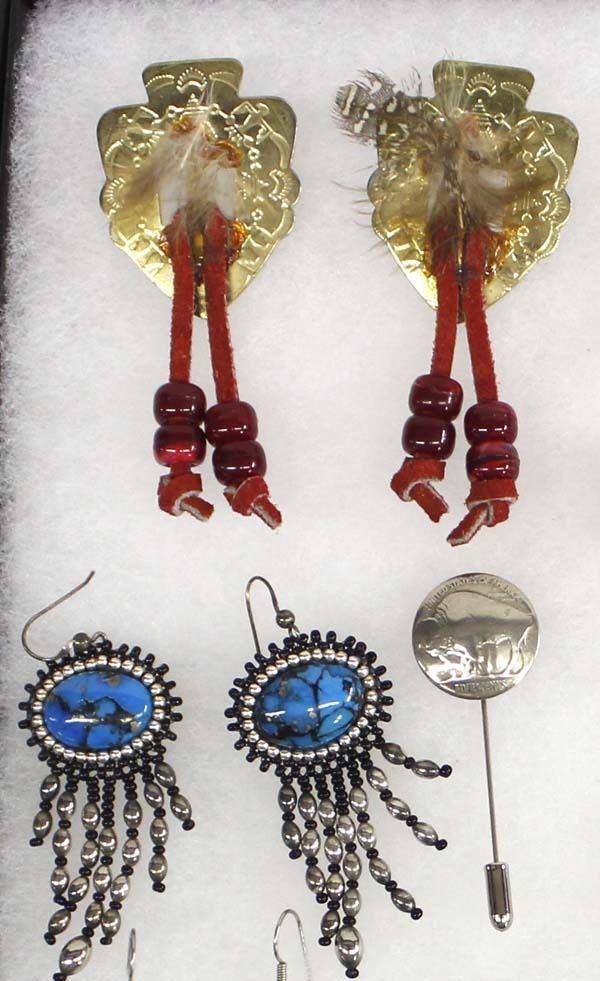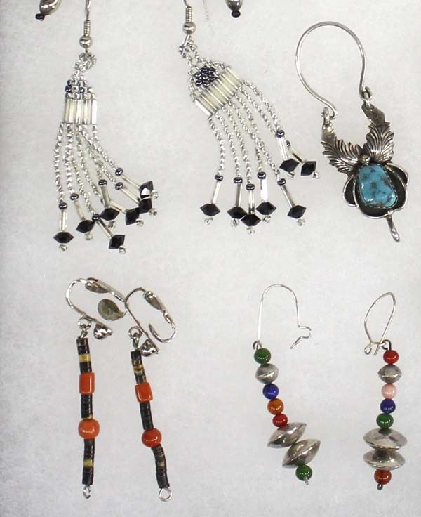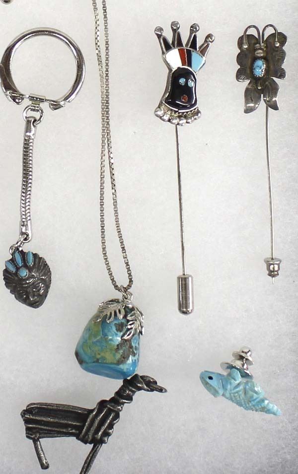 Collection of Jewelry, Mostly Native American, includes sterling silver, coral, turquoise, shell heishi, chip inlay, and Navajo pieces, earrings, key ring, ponytail ties, stickpins, charm pendant, tie tack, 1 single sterling turquoise screwback earring, 1 single branch coral and turquoise nugget earring, longest piece is the turquoise nugget necklace---sterling chain measures 16''L end to end and large turquoise nugget pendant measures 1.25'' x 7/8''