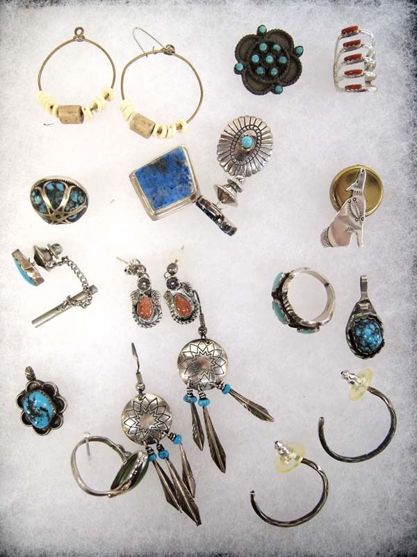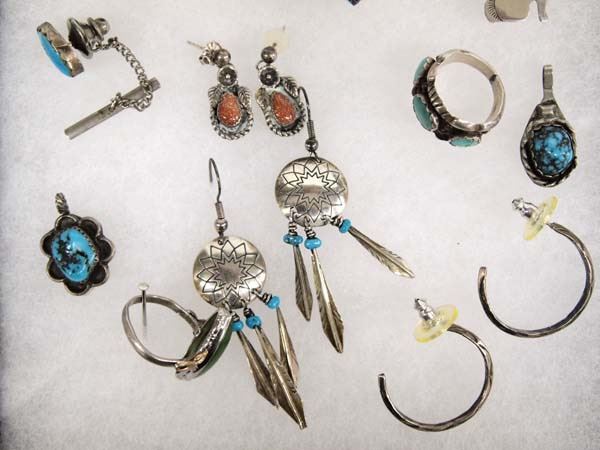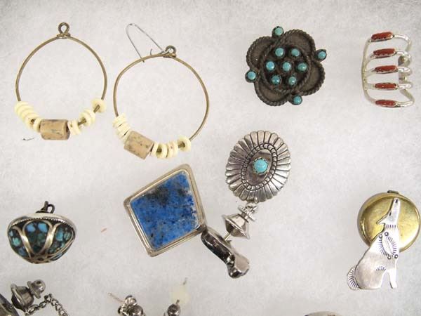 Collection of Jewelry, Some Native American Silver, includes Daniel Zender Button Cover, 1 pin (broken clasp), 2 pendants, 2 Navajo Sterling Rings (1 multi-stone size 6.75 and 1 single stone size 8), 2 Navajo Tie Clasps, 4 pairs of earrings, and 1 Zuni Ear Cuff