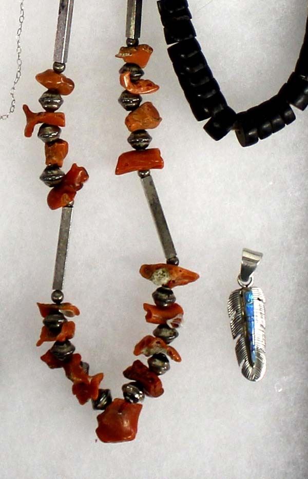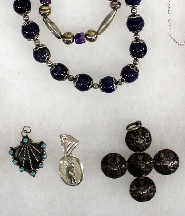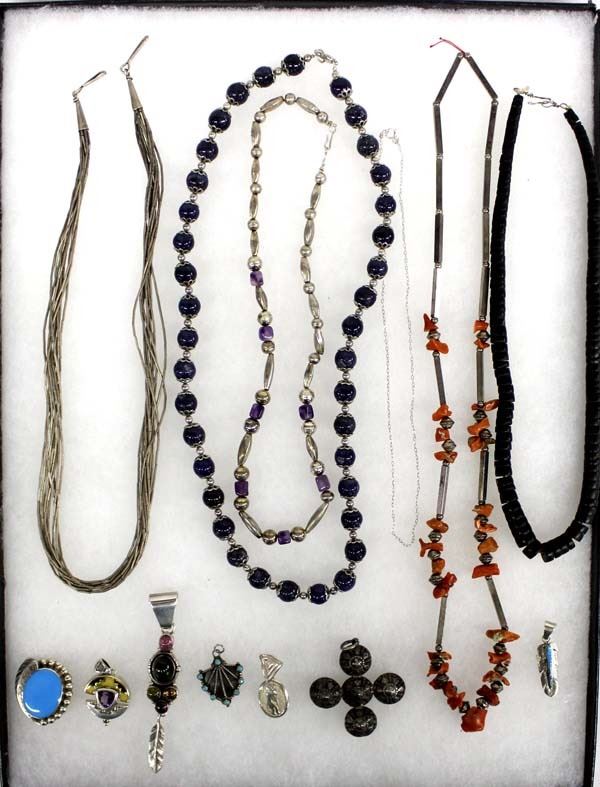 Collection of Jewelry, Some Native American, includes: 1. Vintage Navajo Sterling Silver and Branch Coral Necklace, measures 26''L end to end 2. Navajo Graduated Jet Bead Necklace, measures 20''L end to end 3. Navajo Sterling and Opal Feather Pendant, hallmarked IN and stamped sterling, measures 1.75''L 4. Sterling Silver Chain, measures 17''L end to end, stamped .925 5. Sterling and Sodalite Bead Necklace, measures 22''L end to end 6. Navajo Sterling and Amethyst Bead Necklace, measures 18''L end to end 7. Navajo Liquid Sterling 10 Strand Necklace, measures 21''L end to end 8. Mexican Sterling Turquoise Pin Pendant, measures 1.25'' x 1 3/8'' 9. Sterling and Amethyst Pendant, stamped .925, measures 1.5'' x 1'' 10. Zuni Sterling Turquoise Pendant, pendant measures 1.25'' x 1'' 11. Antique/Vintage Sterling Silver Cross Pendant, cross pendant measures 2''L 12. Navajo Sterling Pendant by G. A. Charley, stunning sterling multi-stone pendant measures 4''L (with feather dangle and very large bale), hallmarked GAC and stamped sterling 13. Kokopelli by J. Rogers stamped .925, measures 1 3/8'' x 5/8''