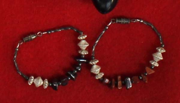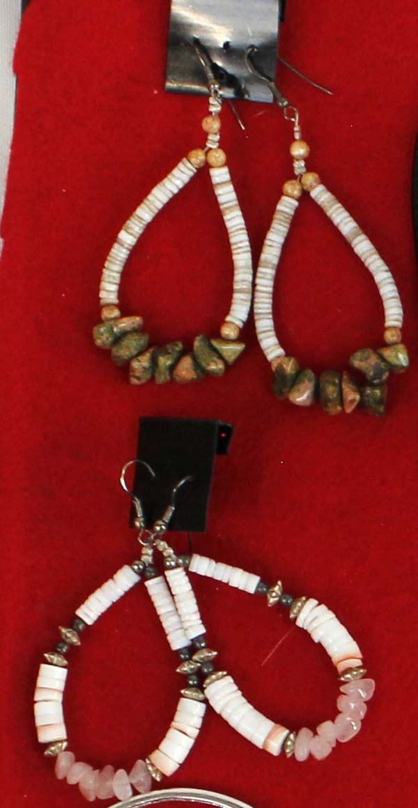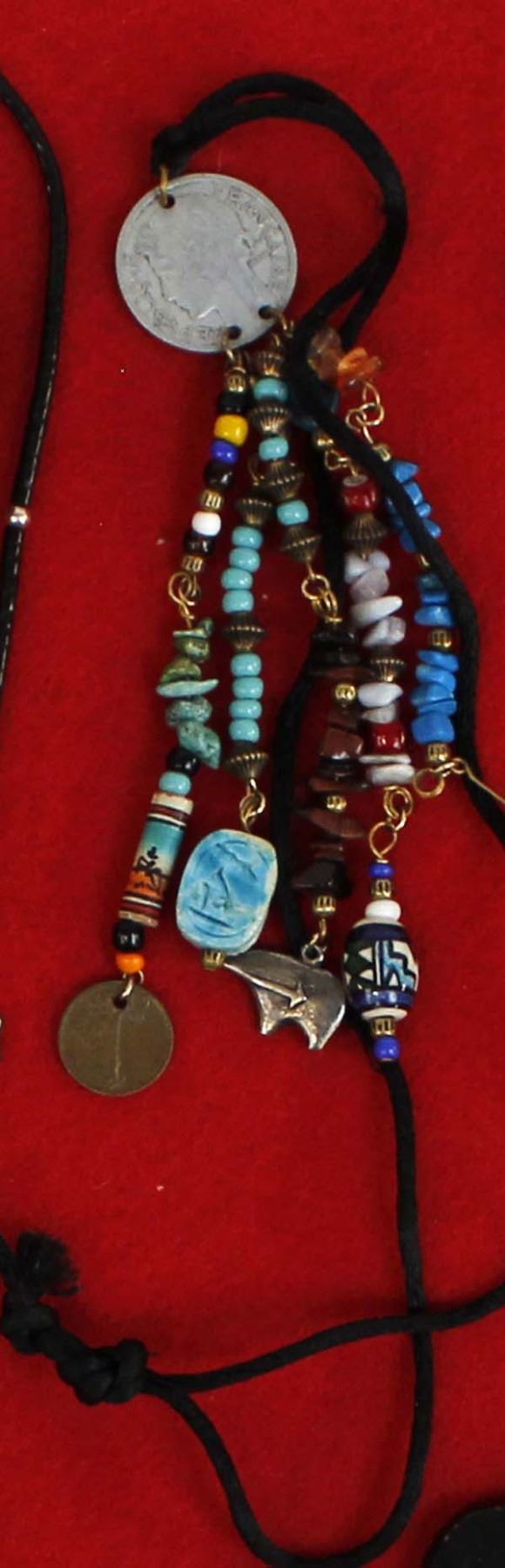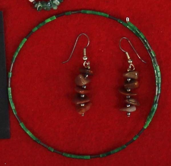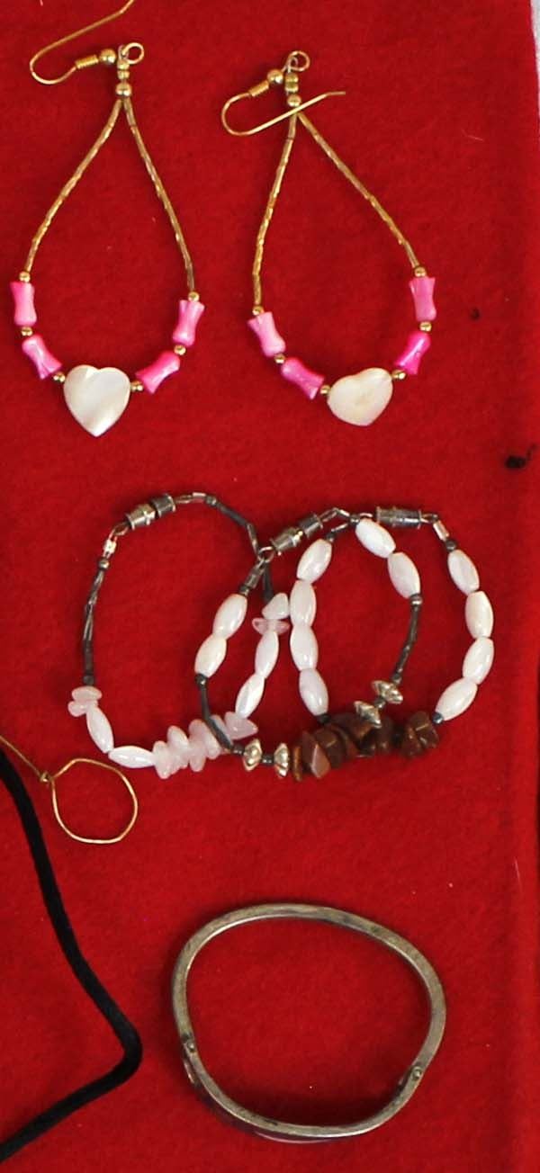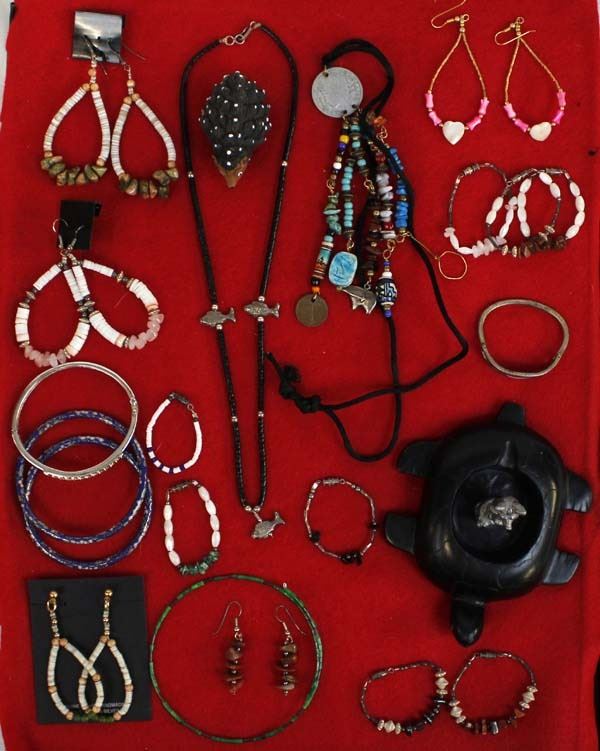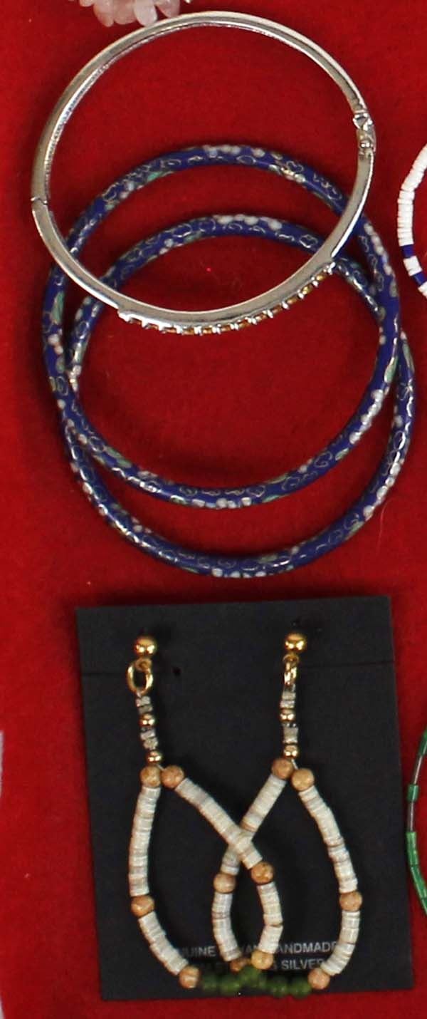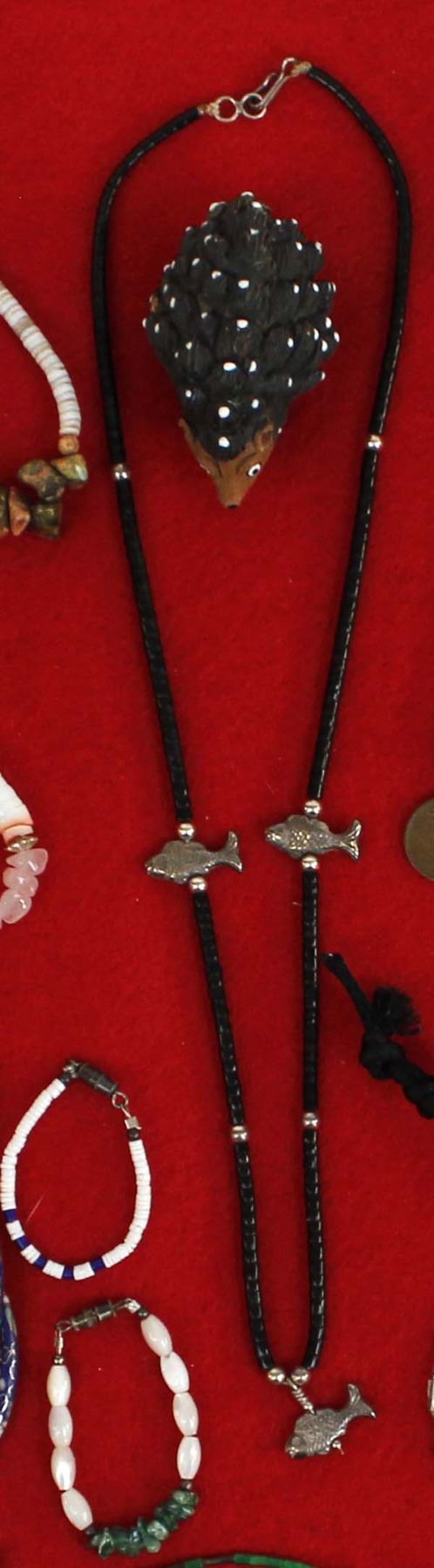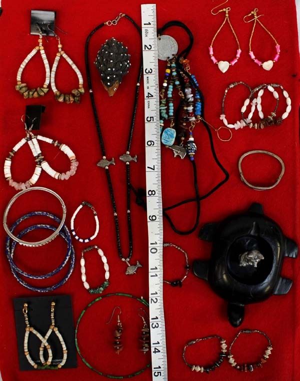 Collection of Jewelry and Collectibles, Some Native American, Some Sterling, includes 1. Four Pairs of Native American Earrings by Helen Gregory 2. Eight Beaded Choctaw-Chickasaw Child's Bracelets and 1 Pair of Earrings by Linda Perry 3. Antique Carved Ironwood Turtle Trinket Box 4. Pewter Whimsical Coyote Figurine 5. Malachite Bead Choker 6. Vintage LEPS Peruvian Pottery Porcupine 7. Mexican Inlay Lapis Bracelet 8. Coconut Shell Heishi and Metal Fish Fetish Necklace 9. Peruvian Multi-Bead Pendant Necklace, longest measuring 24''L end to end with a 6''L drop pendant 10. Two Cloisonne' Bangle Bracelets 11. Sterling Citrine Bangle Bracelet, stamped .925