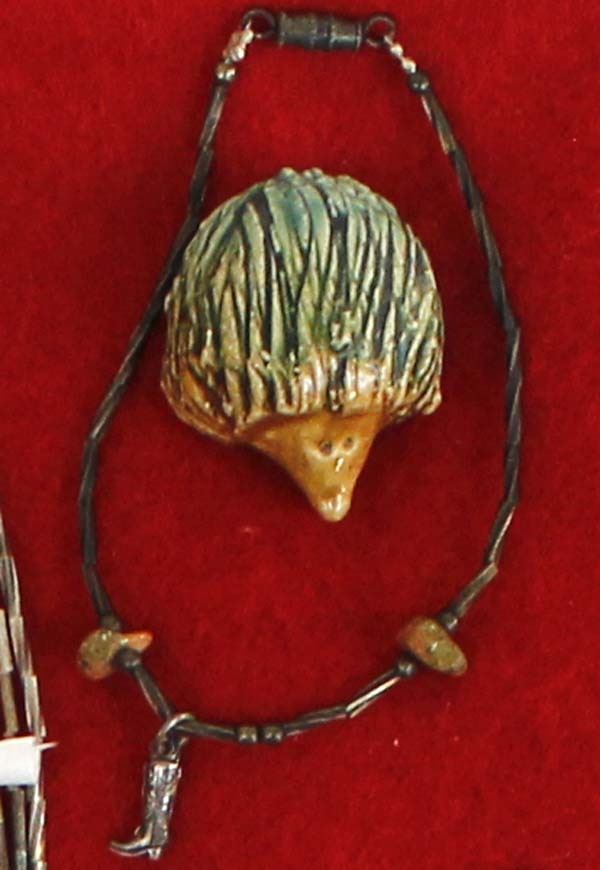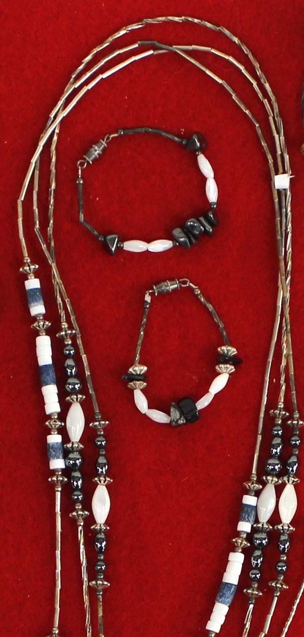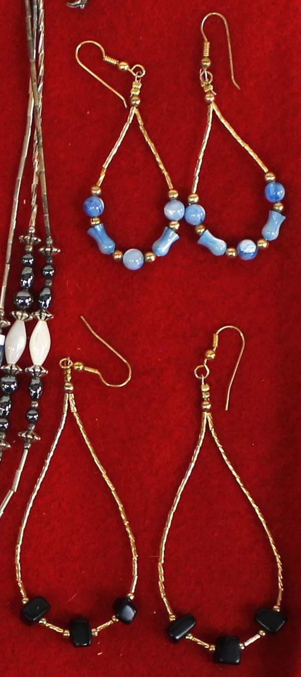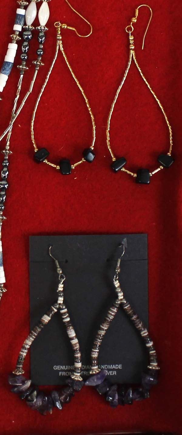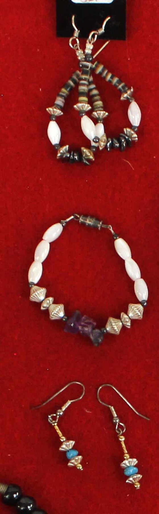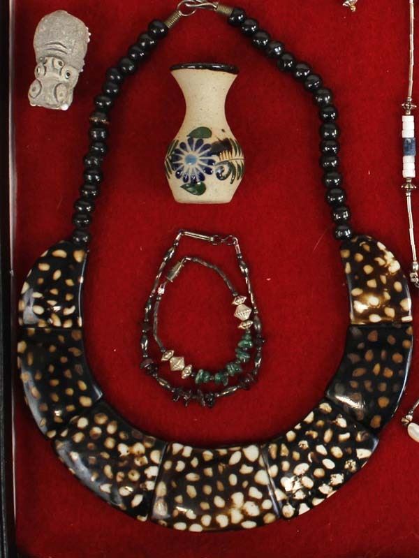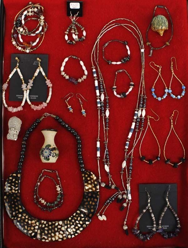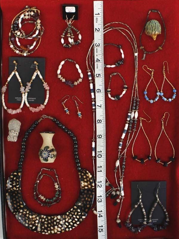 Collection of Jewelry, Some Native American, Some Sterling, includes 1. Native American Pink Quartz Nugget and Shell Heishi Earrings by Helen Gregory 2. Eleven Choctaw-Chickasaw Beaded Bracelets by Linda Perry, adult and child 3. Three Choctaw-Chickasaw Beaded Eyeglass Holders by Linda Perry, longest measuring 26''L end to end 4. Four Pairs of Choctaw-Chickasaw Beaded Earrings by Linda Perry 5. Native American Shell Heishi and Amethyst Nugget Earrings by Helen Gregory 6. Mexican Tonala Miniature Pottery Vase 7. Vintage LEPS Peruvian Pottery Hippo 8. Pottery Hedgehog 9. African Necklace