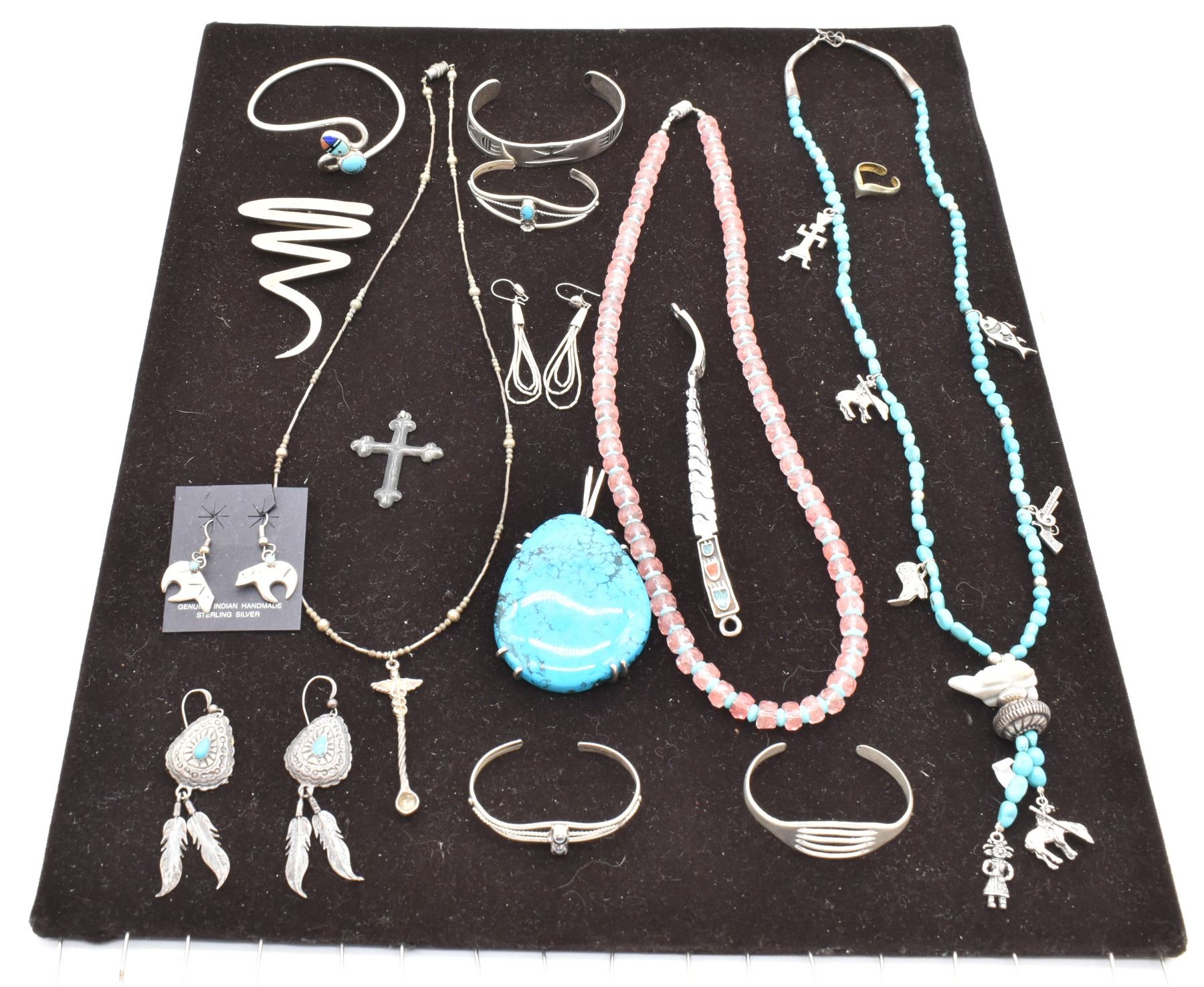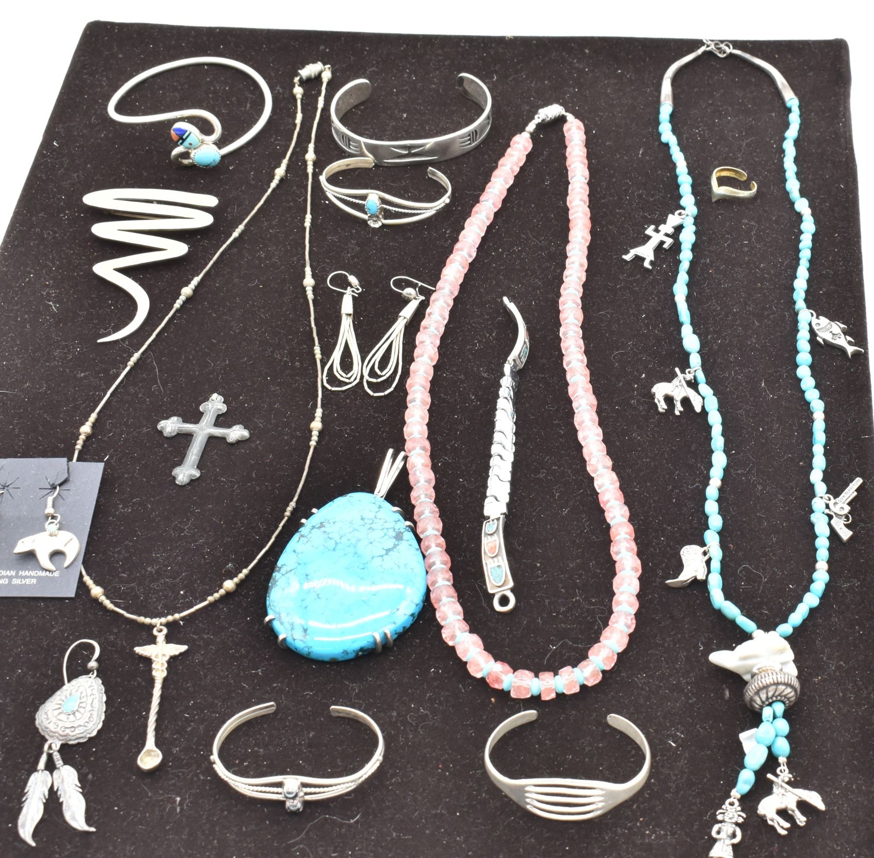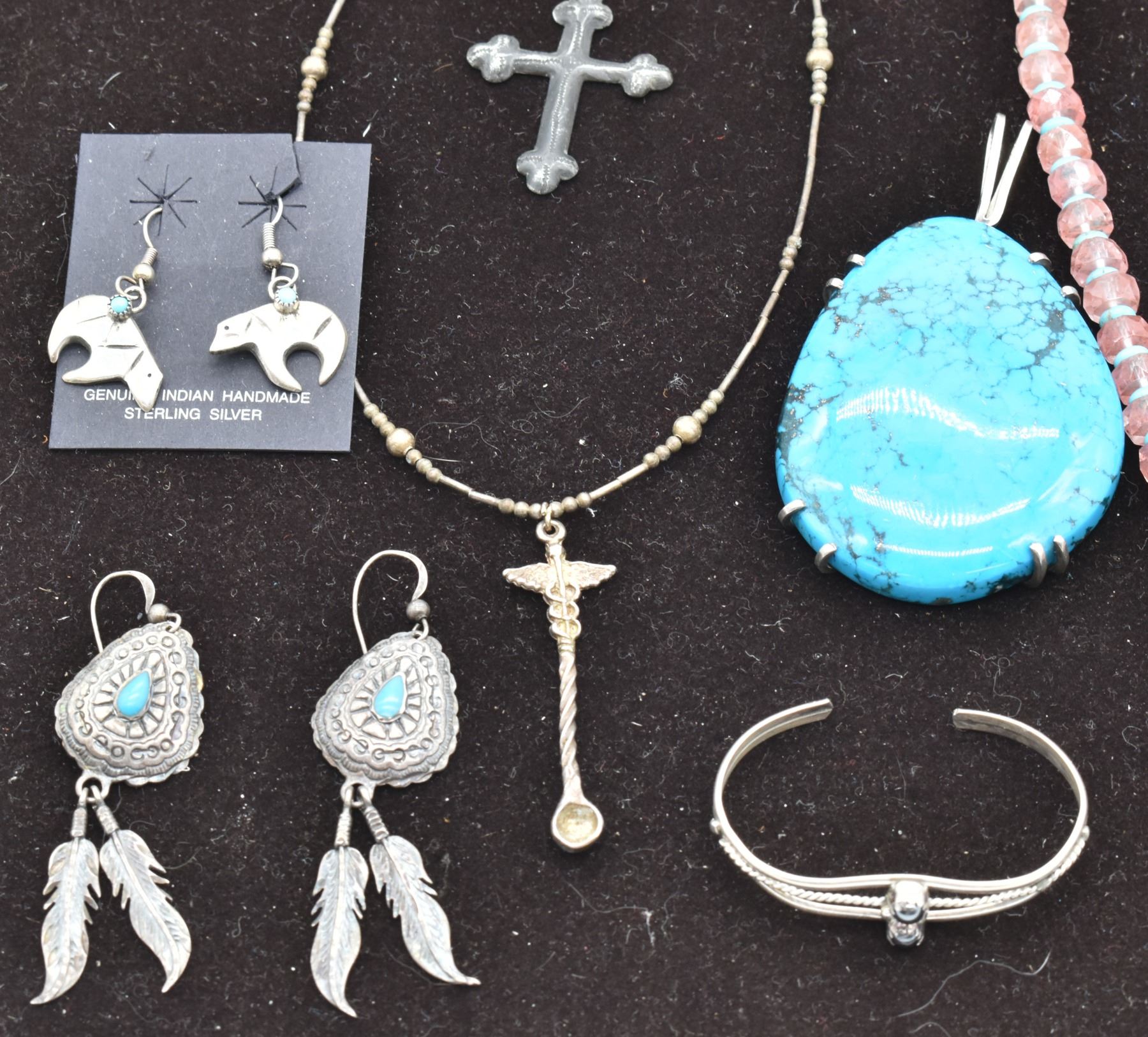 Collection of Jewelry, Some Native American, Some Sterling, includes 3 necklaces, 5 bracelets, pin, watch band, 3 pairs of earrings, and one large pendant, longest necklace measures 21''L end to end