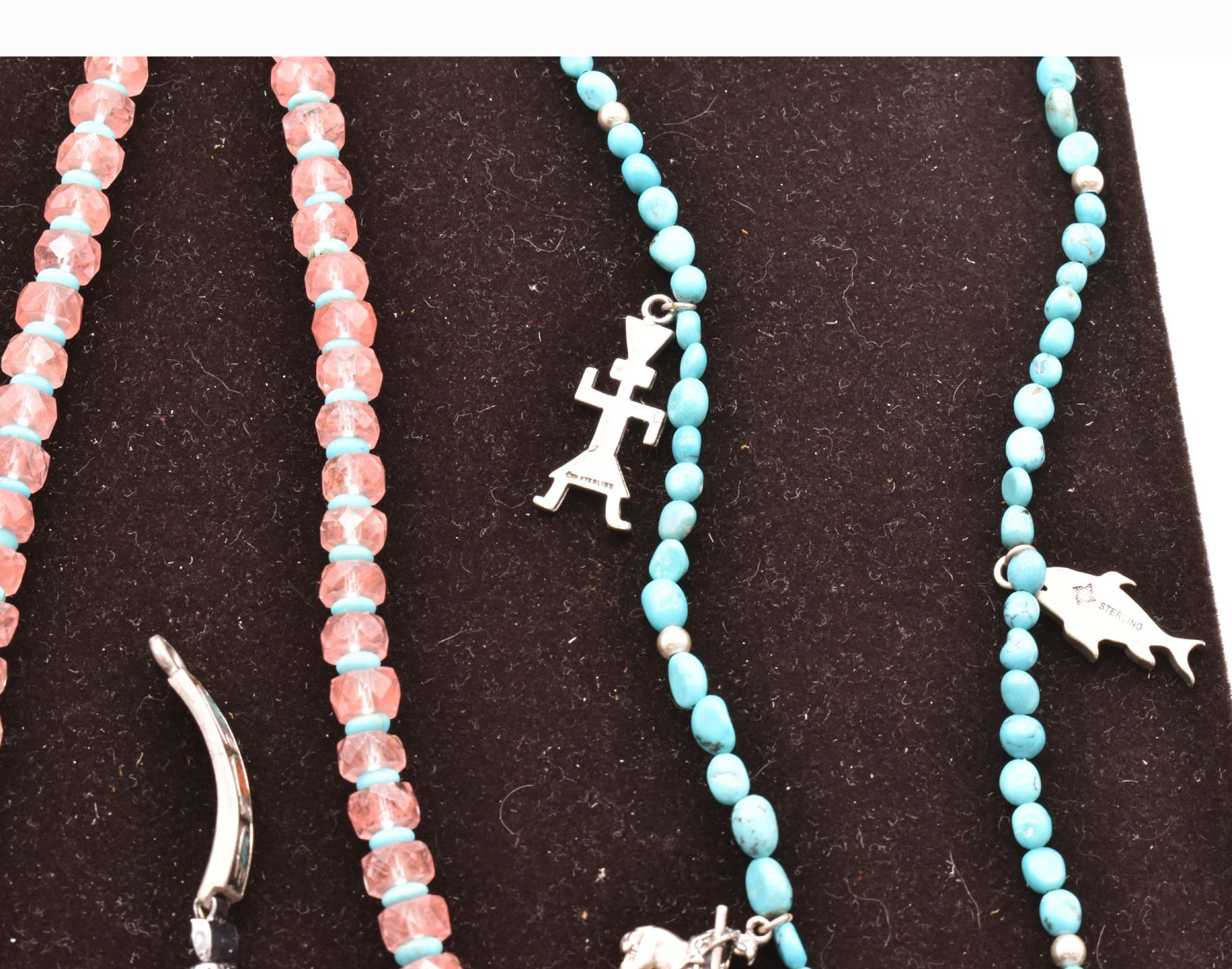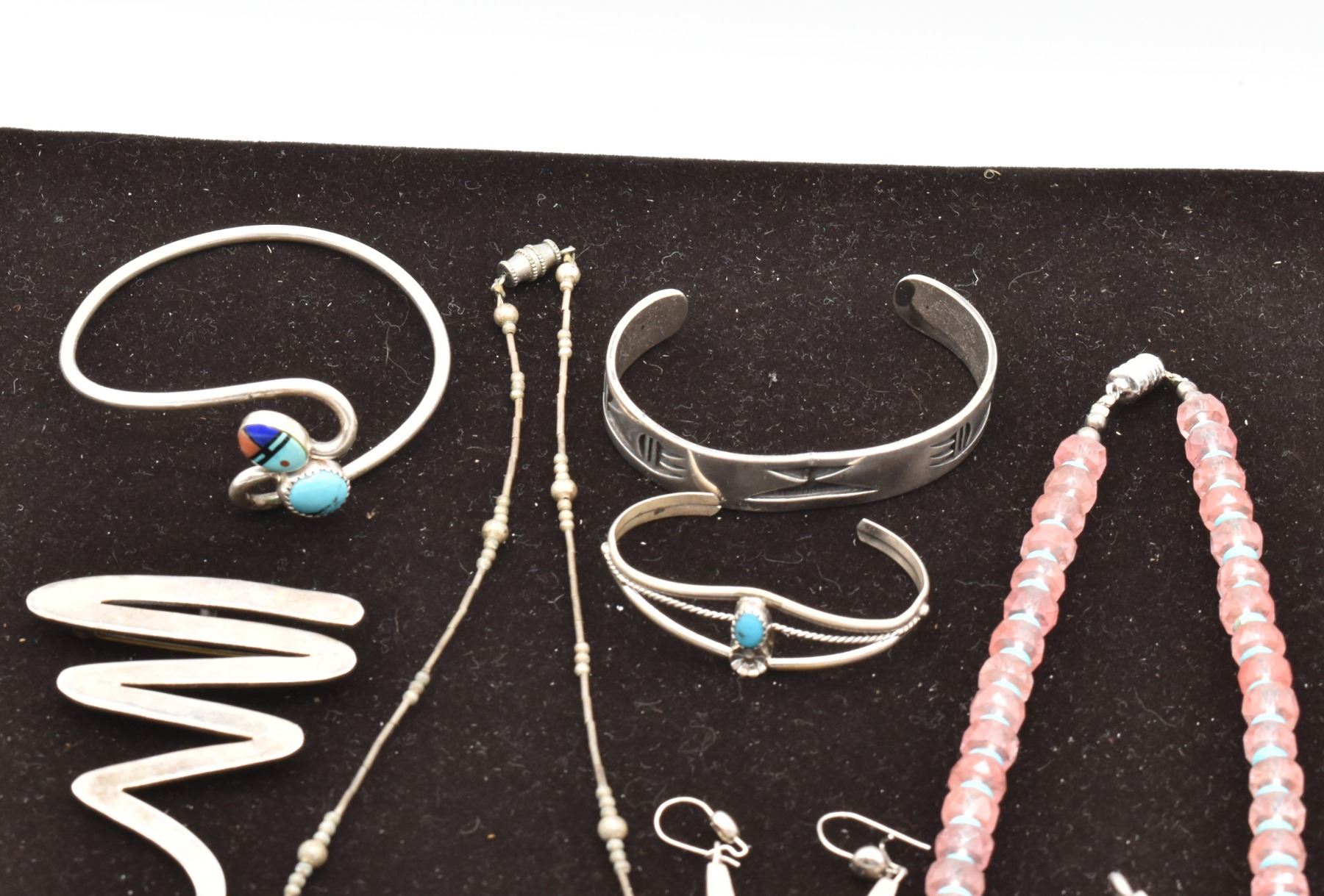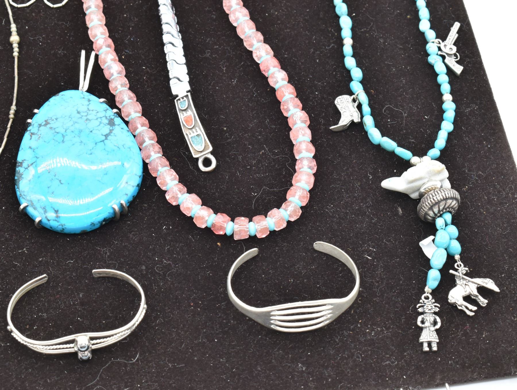 Collection of Jewelry, Some Native American, Some Sterling, includes 3 necklaces, 5 bracelets, pin, watch band, 3 pairs of earrings, and one large pendant, longest necklace measures 21''L end to end