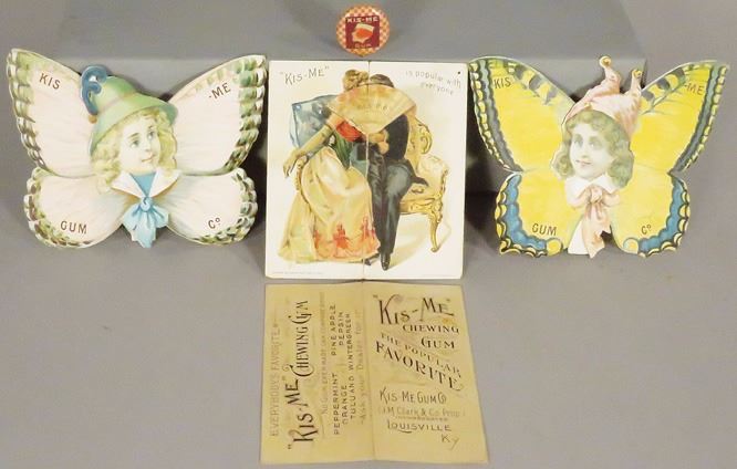 Collection of Kis-Me Gum Trade Cards and celluloid button. Fan torn on one card otherwise overall near mint to good condition.
