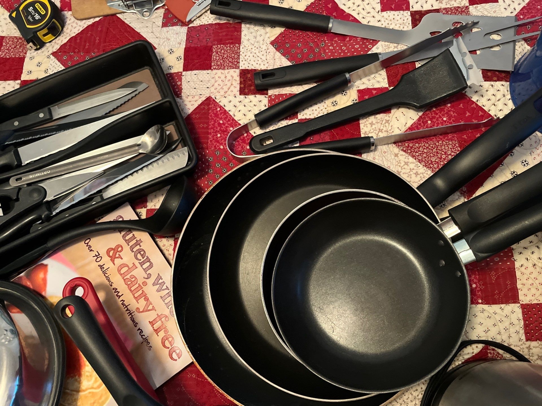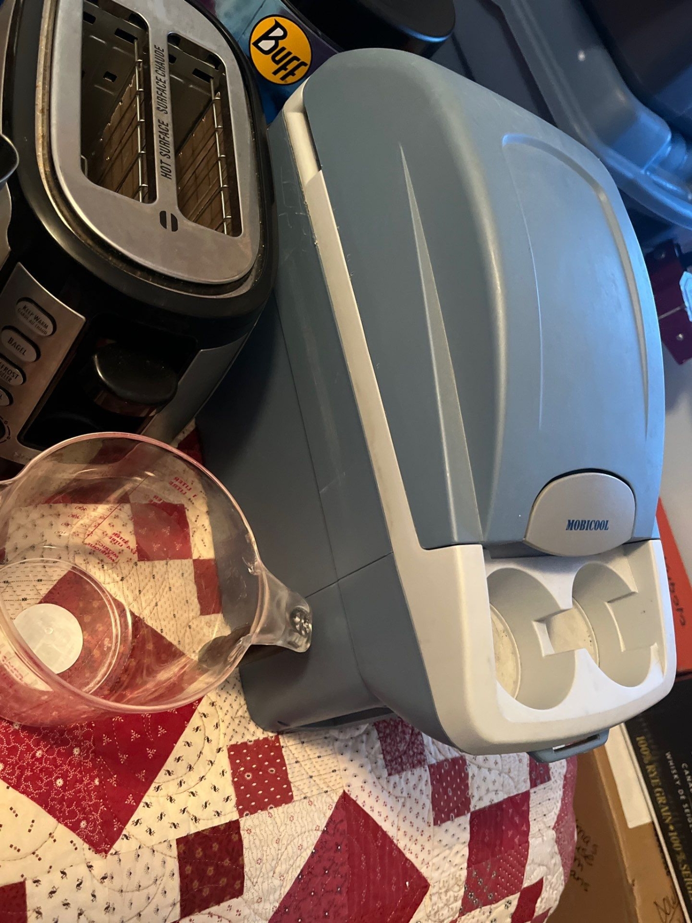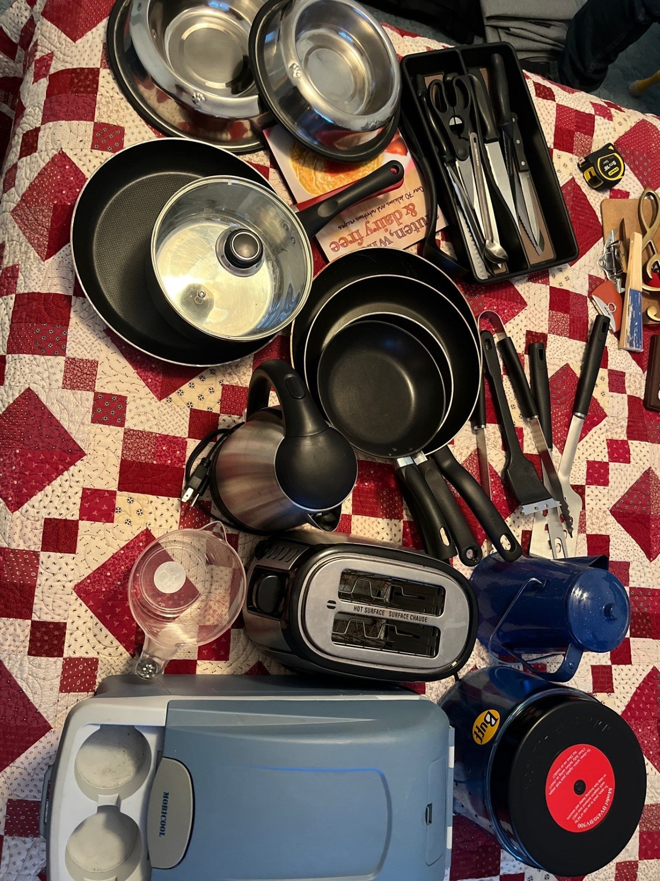 Collection of Kitchen items. Included is a electric travel Cooler, BBQ utensils ,Knives, Frying pans, Toaster, electric kettle , blue speckled enamel camp kettle and a bear proof container