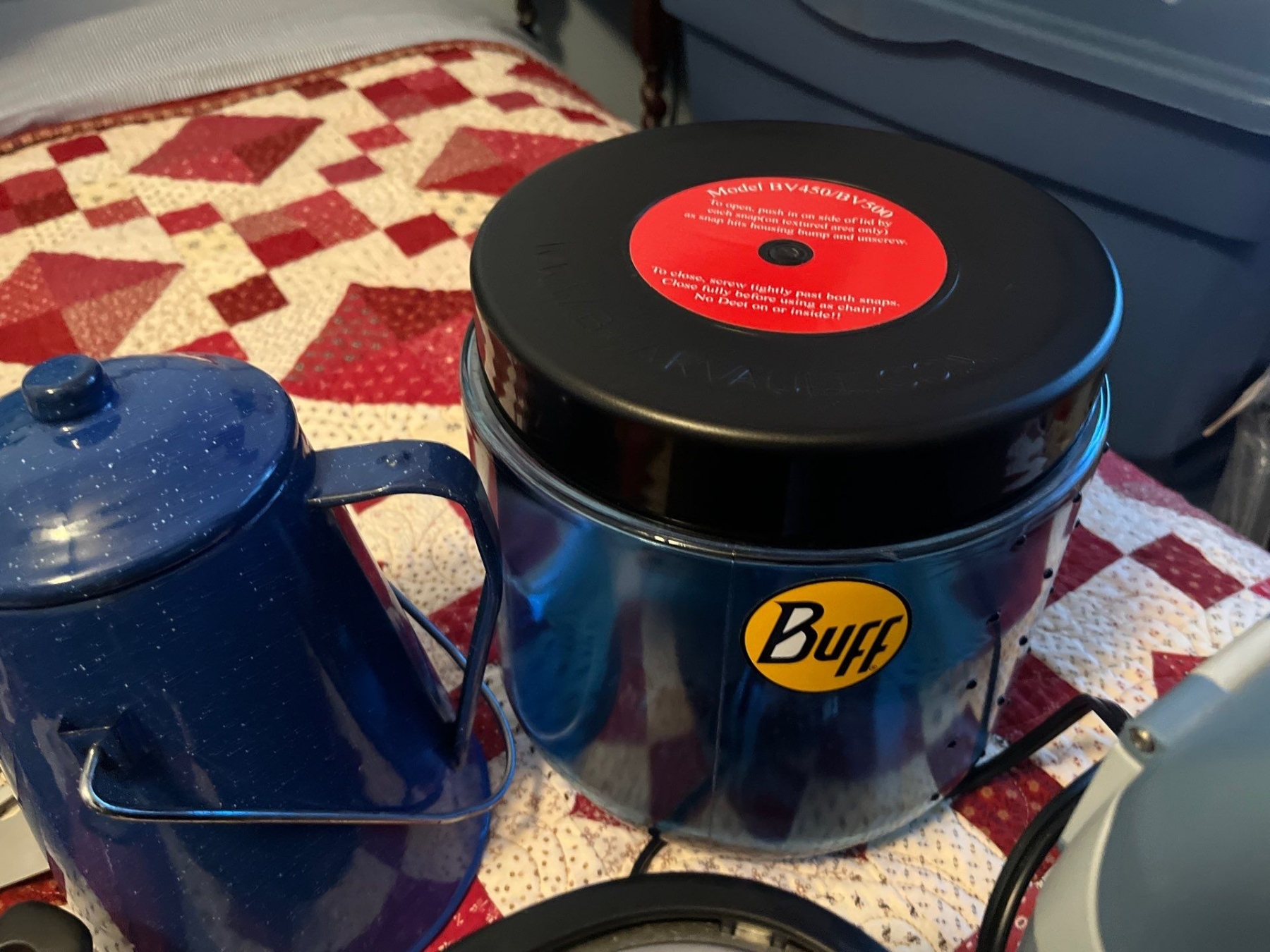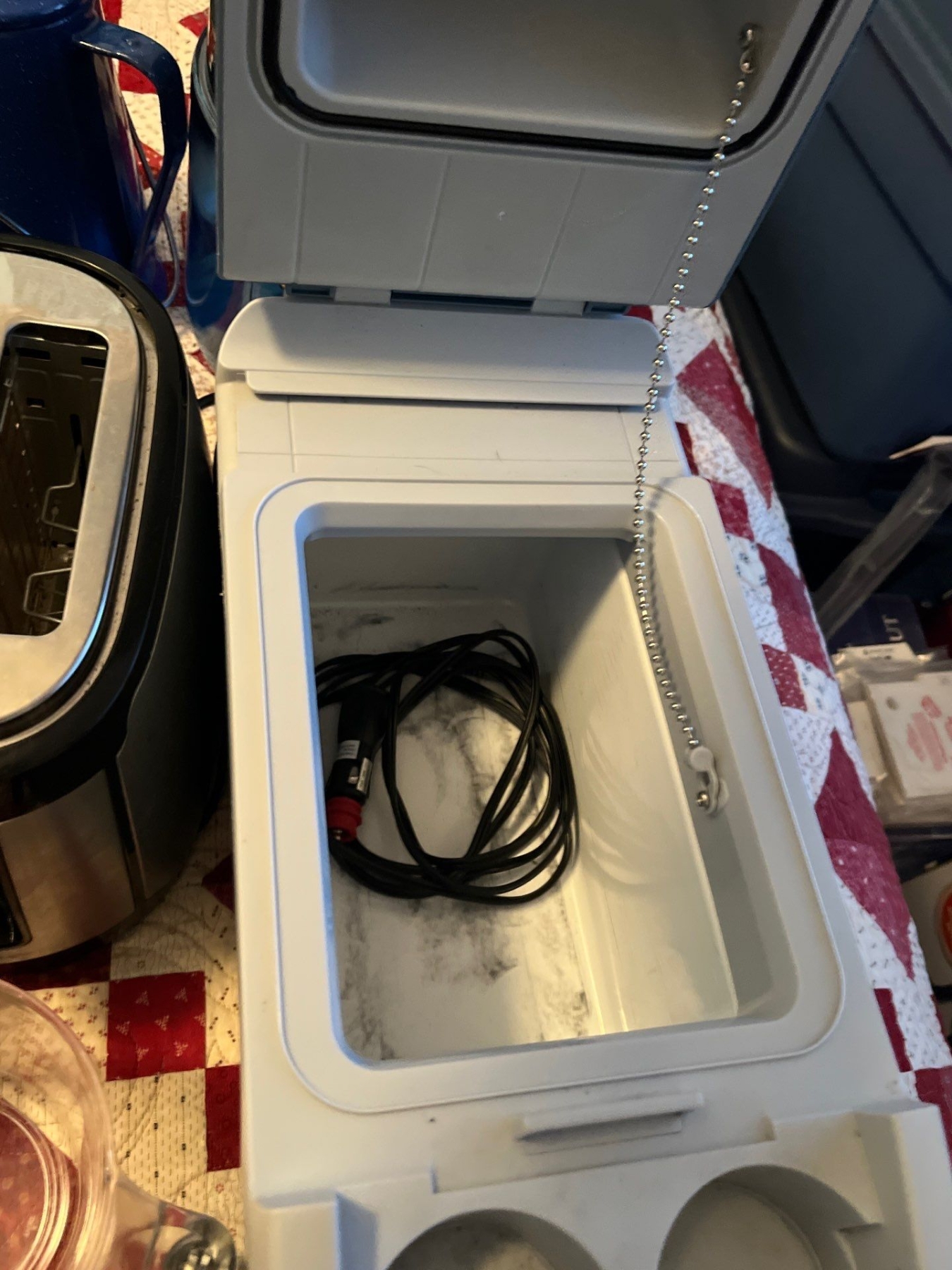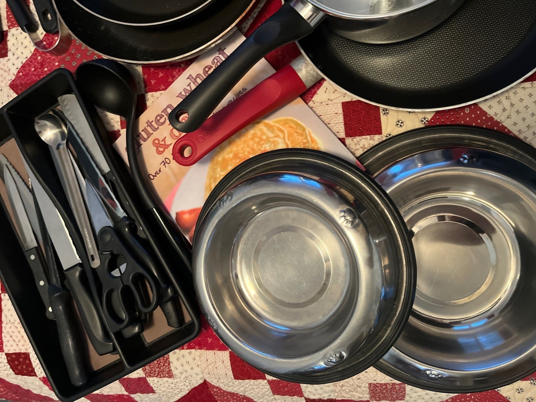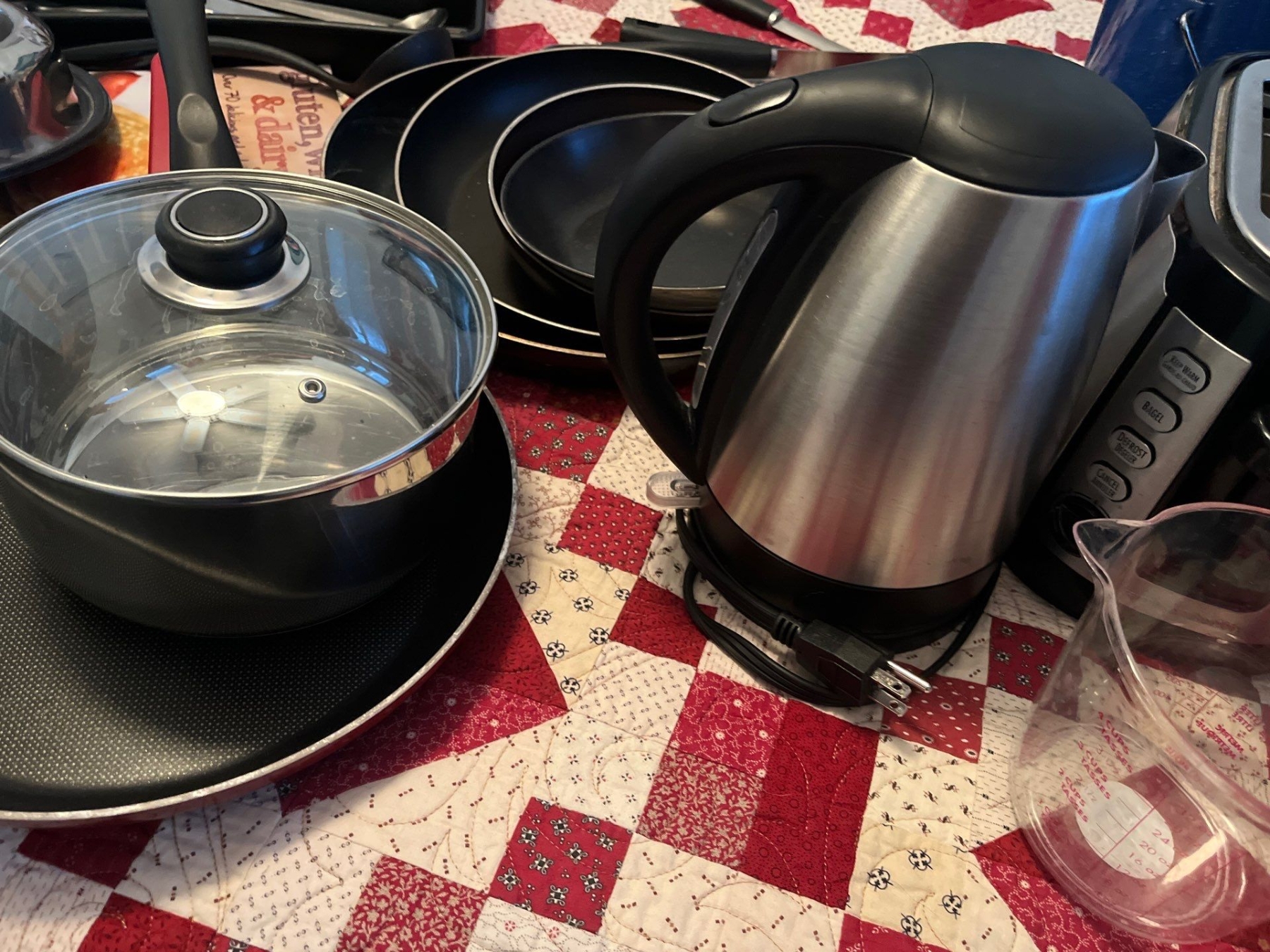 Collection of Kitchen items. Included is a electric travel Cooler, BBQ utensils ,Knives, Frying pans, Toaster, electric kettle , blue speckled enamel camp kettle and a bear proof container