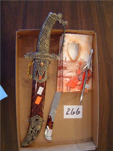 Persian Style Sheath Knife, 9" blade, 1 pocket knife - 6" and three 6" Silver tone, Rams Head Style, Letter Openers. Sheath knive and pocket knives have 440 Stainless Blades.