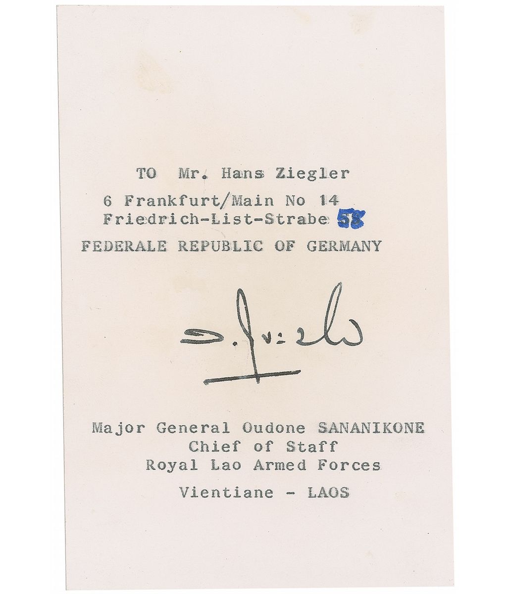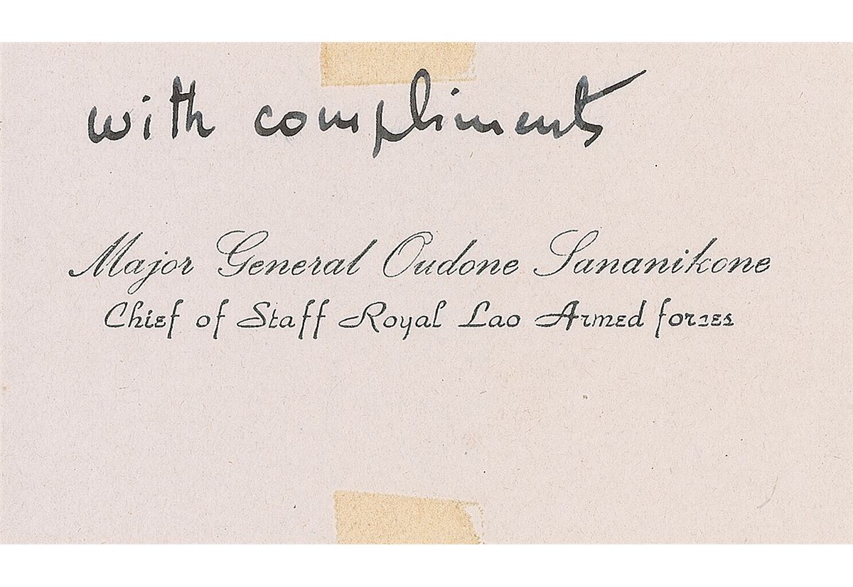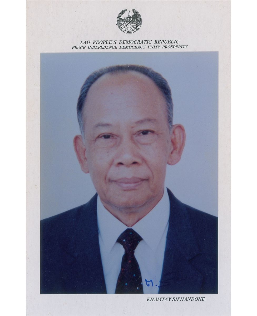 Collection of three items, each signed by a Laotian leader, including: Kaysone Phomvihane (ALS), who was the leader of the Lao People's Revolutionary Party from 1955 until his death in 1992; Khamtai Siphandon (SP), who was president from 1998 to 2006; and Oudone Sananikone (SP signed on the reverse), an aristocrat who served as director general of the military. In overall fine condition, with light contrast to Khamtai Siphandon’s signature.