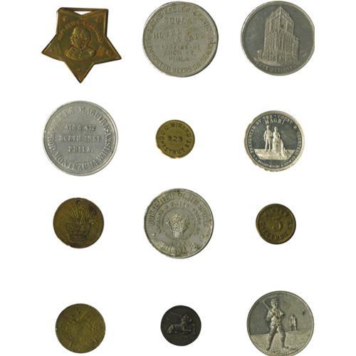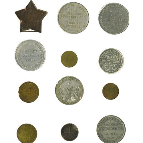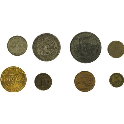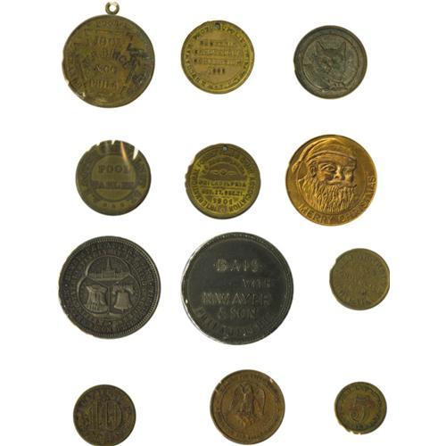 <B>A Highly Varied Collection of Late 19th Century and Early 20th Century Philadelphia Storecards, Many Very Rare.</B></I> George Arnholt (brass, XF); N.W. Ayer and Son (2 - 35mm, silver, AU); W.P. Buchanan Photo Materials, Cat pictorial (brass, 1895, XF; 1896, XF, holed); W.R. Brice and Co., 1901 (brass, looped, XF); A.E. Gotsh Pool Tables (brass, VF); International Forest, Fish and Game Association of Pennsylvania, Moose pictorial (brass, XF, holed); Kugler's Restaurant, Santa Claus pictured (brass, AU); Lafayette Restaurant, 10, (brass, fine); Samuel Lashof (brass, VF); James Maguire Montezuma Whiskey, 1890s (aluminum, VF); C.C. Minerd, 1890s (brass, XF); 9th and Arch St. Museum, Tom Thumb and wife pictorial, 1895 (white metal, UNC); Philadelphia Rifle Club 1871, (brass, VF); Saint Andrew's Guild of Saint Mark's (silvered brass, XF, scratches); Schoeneman, Langstadter, & Co., picturing baseball batter and pitcher (white metal, AU); B. Selig & Co., Gov. Philip H. Sheridan, star shaped fob (brass, XF); Soula's Hotel and Cafe (2 -aluminum, XF); Victoria Cordage Works (brass, XF, holed); Heikel and Smith, Columbian Expo (aluminum, VF, pest); Winter $5 Token (brass, VF). Philip J. Lauber's Restaurant, (brass, VF); 24 pieces.