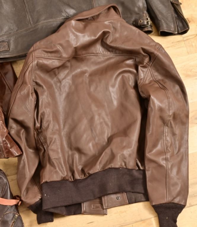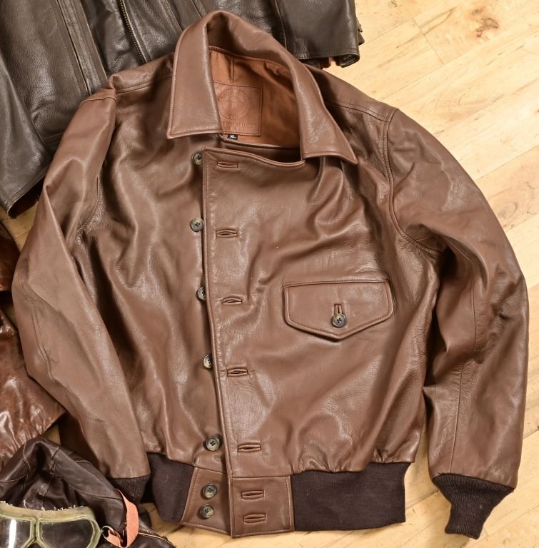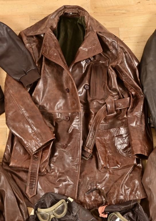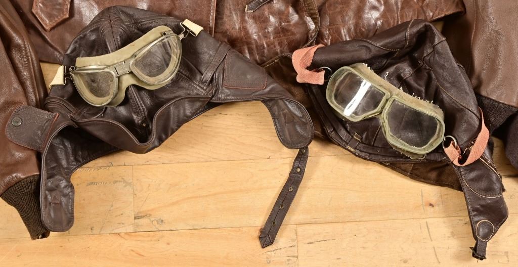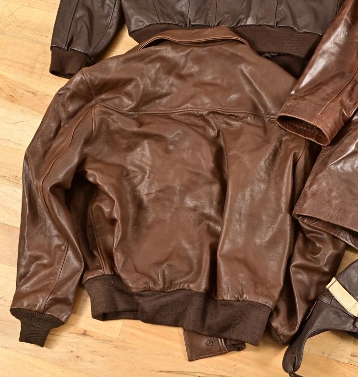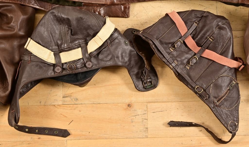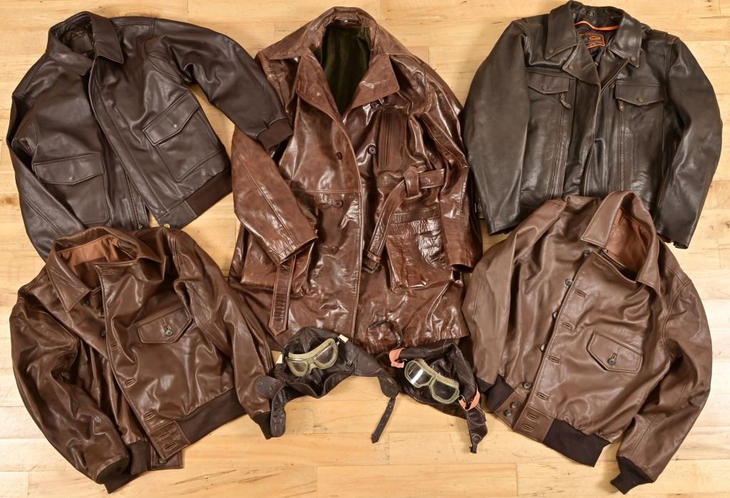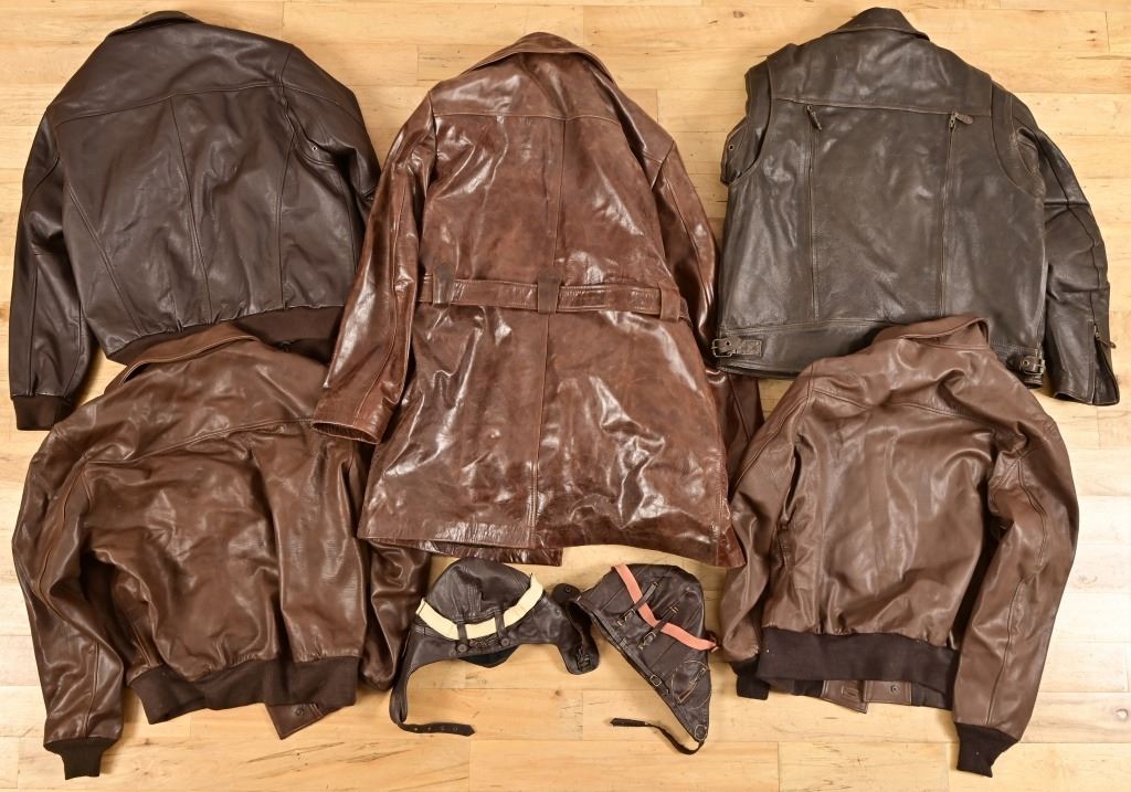 Collection of 5 leather flight jackets and 2 leather flight caps complete with goggles.