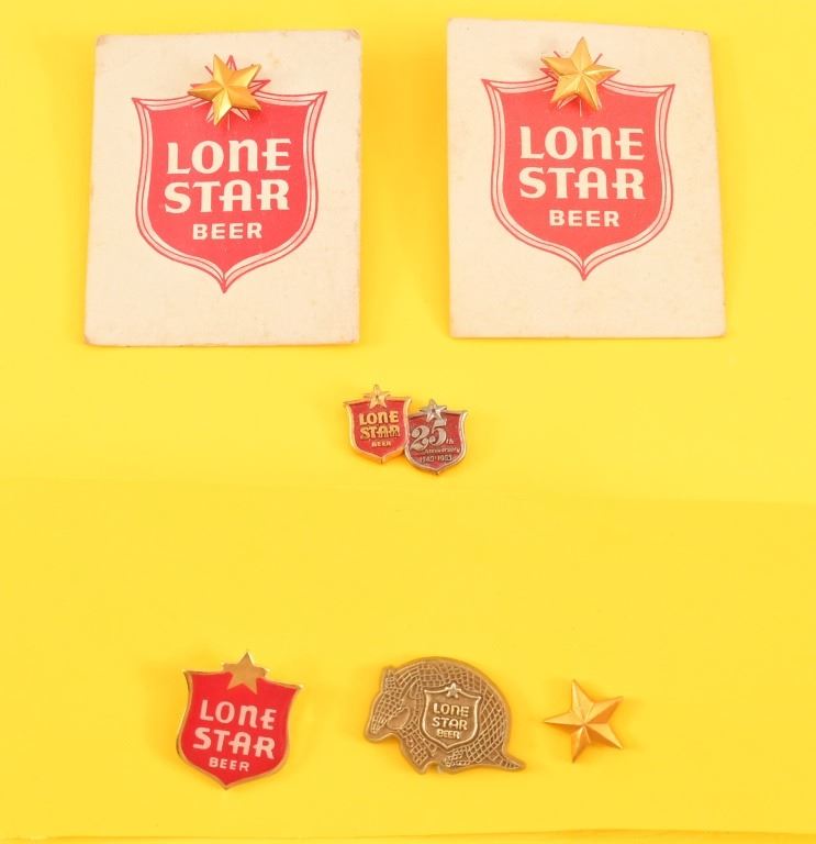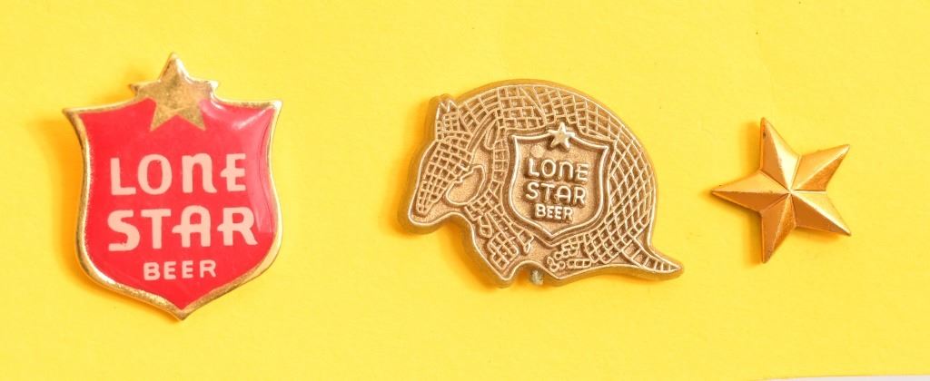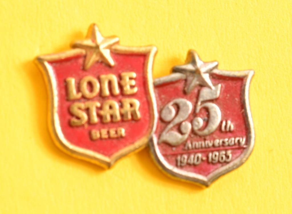 Circa 1940-1965, 25th Anniversary Lone Star employee lapel pin. Threaded post and screw on nut on back, this was a brewery employee only item. Also included is an armadillo pin,