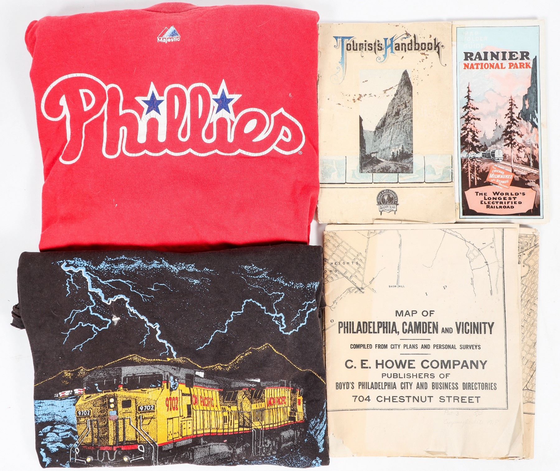 Lot of 5. 1901 Denver & Rio Grande Tourist Handbook, Rockies Route. !918 map of Philadelphia, Camden and Vicinity approx.40x40 unfolded. Union Pacific T-Shirt, and a Phillies T-shirt complete w/holes., Rainier National Park brochure.
