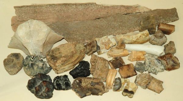 Petrified wood, mammoth teeth & fossils. Longest piece measures approximately 28" long.