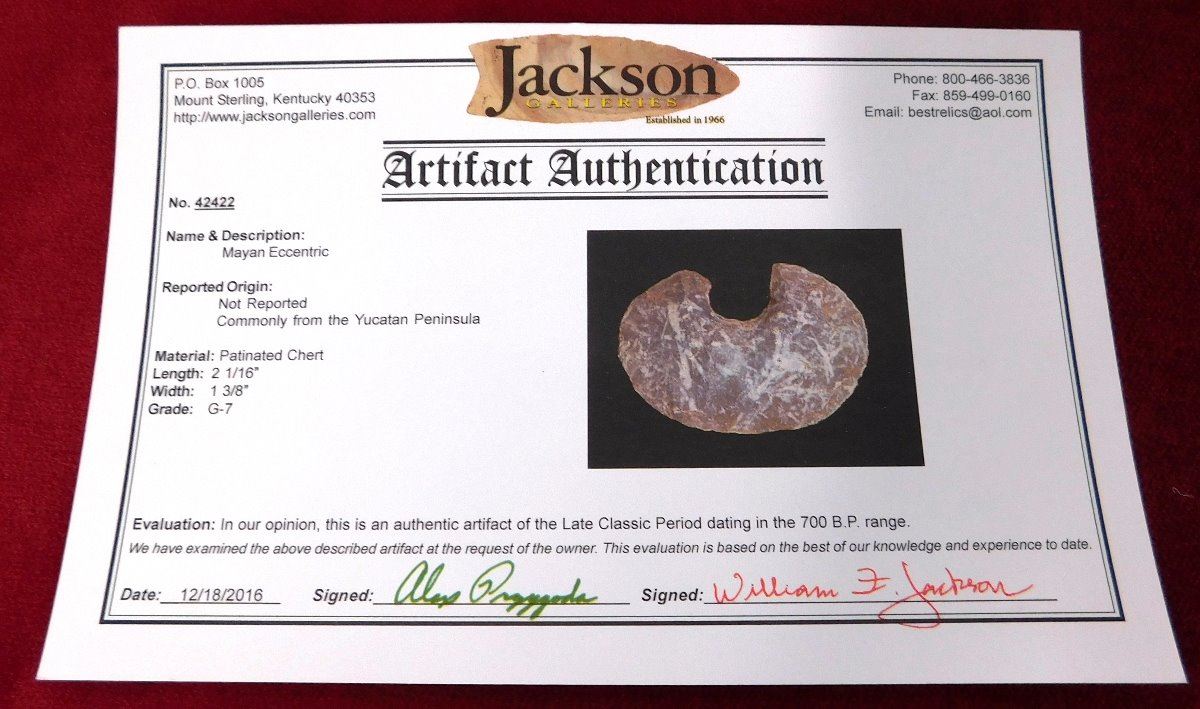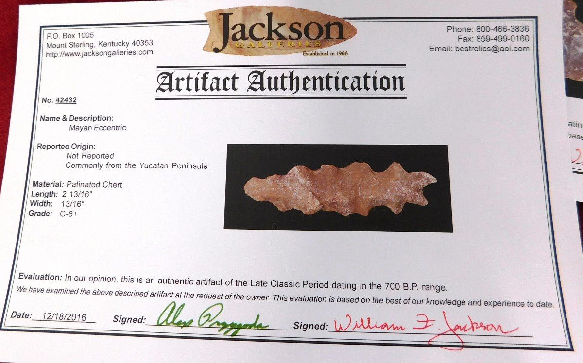 Collection of Mayan Eccentrics w/Jackson COAs, c. 700 yrs B.P. Made of patinated chert, the items are 2" to 2 13/16". Yucatan Peninsula. Investment quality Mayan artifacts. Frame not included. Condition: Grades 7 and 8, see images. Shipping: $22.50 w/insurance and signature.