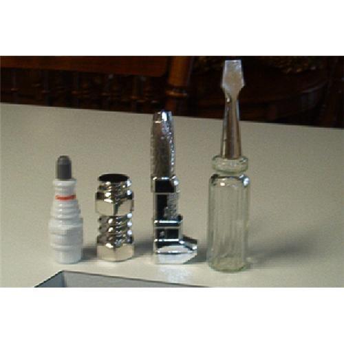 Featuring 3 Avon "TOOLS" and 1 Avon "SPARKPLUG". All four bottles are in excellent condition. The first tool bottle is a glass bottle with the handle in silver tone color and looks like a screwdriver. The second tool is a silver tone covered glass bottle which appears to be a large bolt and nuts. The third tool is also siver toned covered glass wrench. The fourth bottle is a white glass "CHAMPION" sparkplug. Great collectible men's Avon bottles.