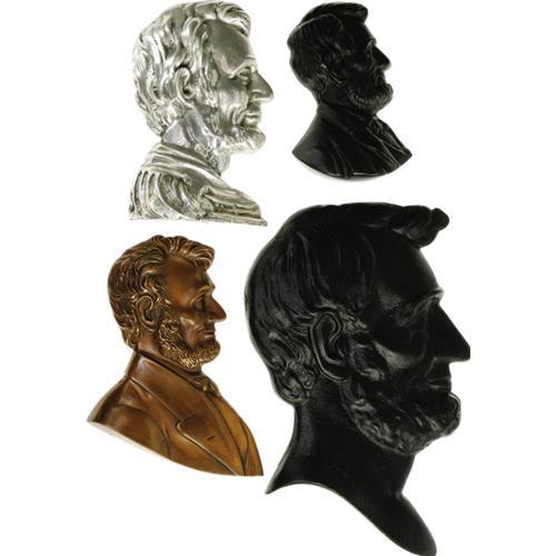 <B>Collection of Metallic Lincoln Profile Relief Wall-Hangings.</B></I> This lot consists of four iron-cast Lincoln facial profiles, one of which is silver-plated, one of which is bronzed, and two of which are painted black. 1.) Small black Lincoln profile measures approximately 3.75" wide at its widest point x 5.5" tall. Artist's signature on back reading "Emig". No maker's mark. 2.) Bronzed Lincoln profile measures approximately 5.25" wide at its widest point x 7.25" tall. No artist's or maker's mark. 3.) Silver-plated Lincoln profile measures approximately 4.5" wide at its widest point x 6.75" tall. This piece could either be affixed to hang or stand alone on a desk or bookshelf. No artist's or maker's mark. 4.) Large black Lincoln profile measures approximately 6.75" x 11.5" tall. No artist's or maker's mark. A good assortment for any Lincoln collector.<BR><BR><b>Shipping:</b> Miscellaneous Collectibles, Larg (<a target="_blank" href="http://www.heritageauctions.com/common/shipping.php">view shipping information</a>)