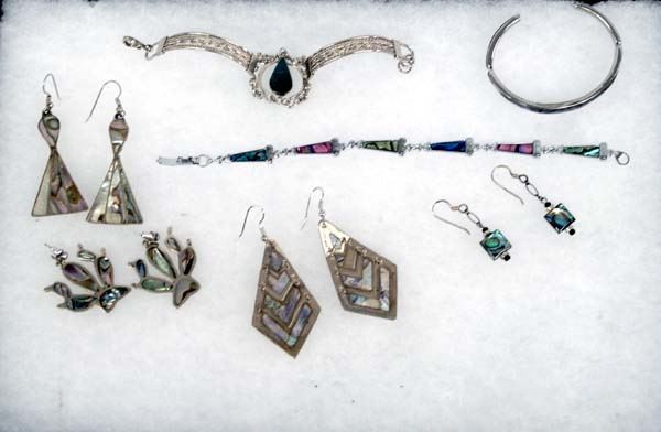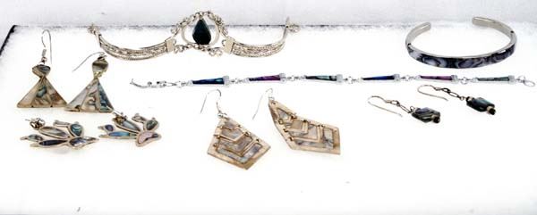 Collection of Mexican Alpaca Silver Jewelry. We have 3 pair of pierced earring inlay with abalone, 1 cactus pair. 1 small pair abalone pierced earrings, 2 wrist cuff bracelets, & 1 link bracelet. The abalone link bracelet measures 8'' end to end.