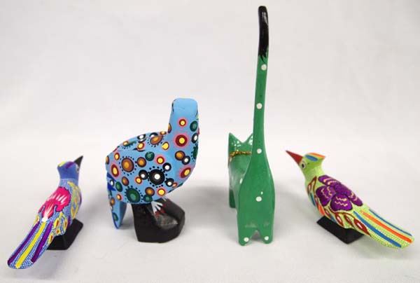 Collection of Mexican Oaxacan Alebrijes, includes 2 signed roadrunner, eagle by Victorino Sosa Vincente, and unsigned cat, largest measures 3'' x 3''