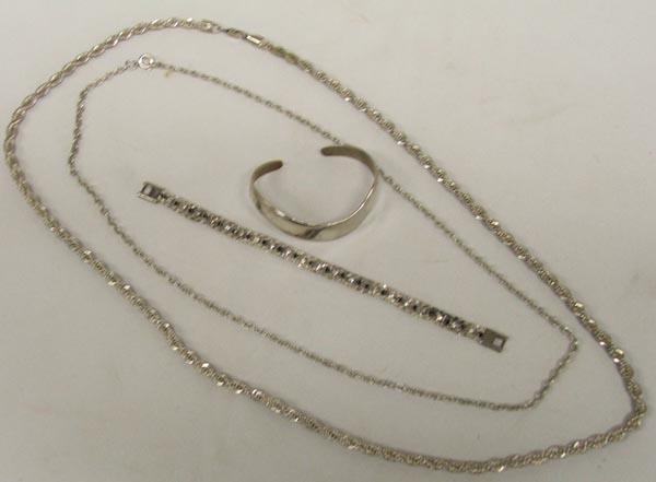 Collection of Silver Jewelry, 4 pieces to include 2 chains and 2 bracelets, longest measures 30''bracelet marked Taxco, clasp broken on one bracelet. SHI $15.
