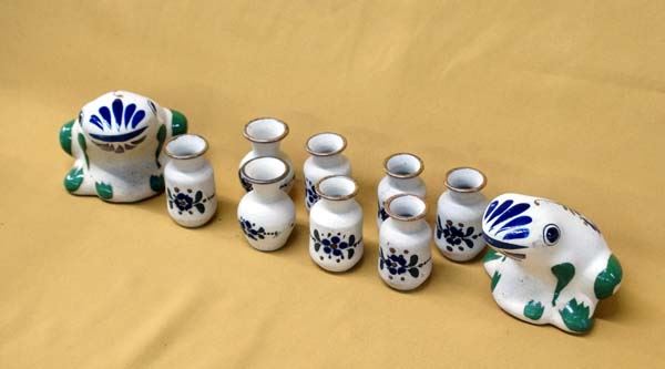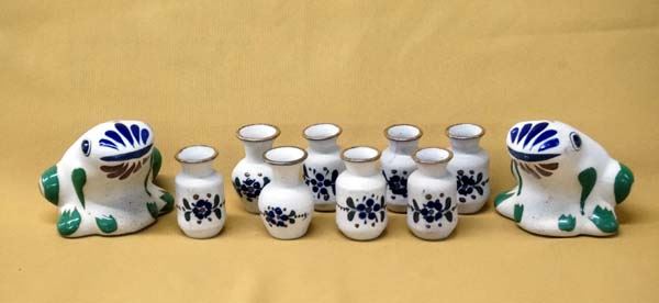 Collection of Mexican Tonala Frogs and Pottery, largest measures 3.5''H, includes 2 frogs and 8 miniature pottery vases